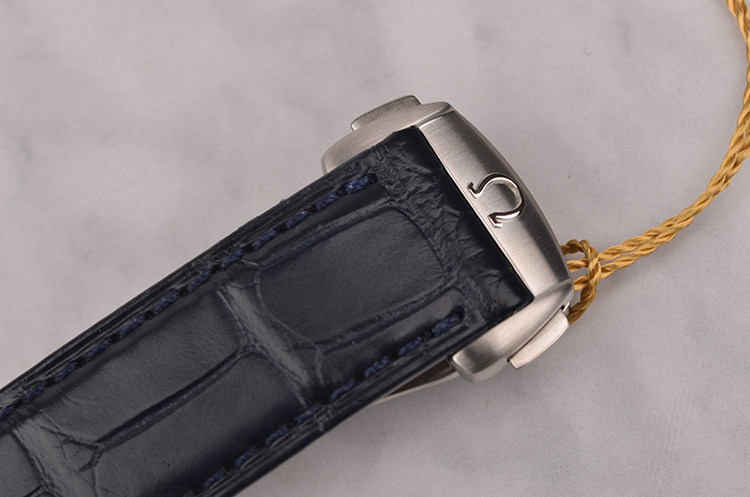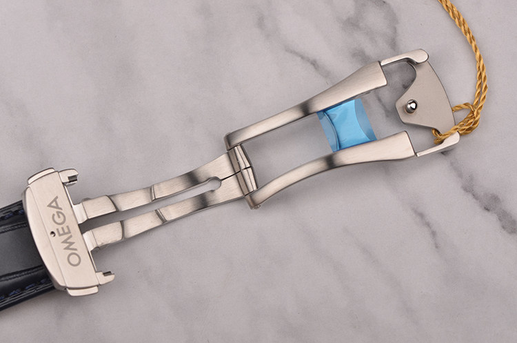 精钢表壳及按压式折叠表扣,全新原装深蓝色鳄鱼皮表带。蓝宝石水晶镜面及底盖,立体蓝色“柚木”条纹表盘,夜光指针及刻度,天文台认证标识,大三针设计,3点位日历显示窗口。口径41.5MM*13.4MM。旋入式防水表冠,防水150M。