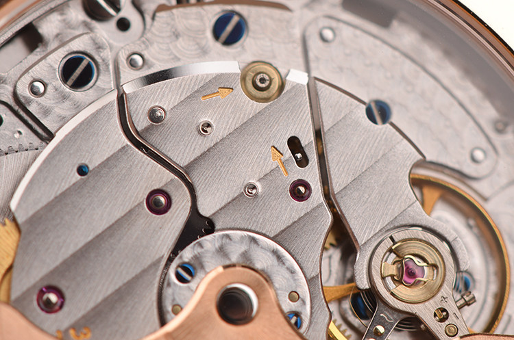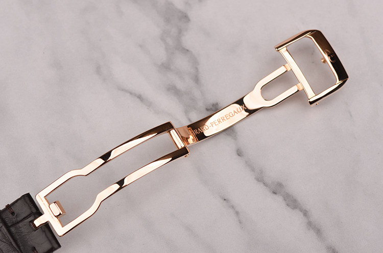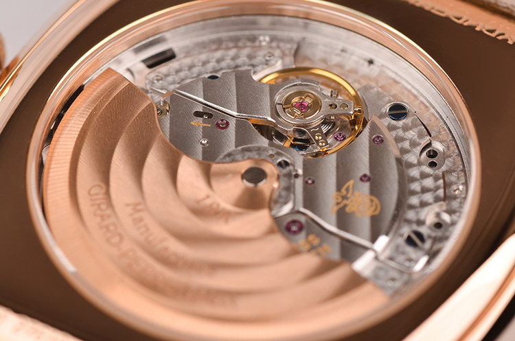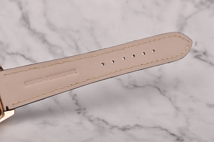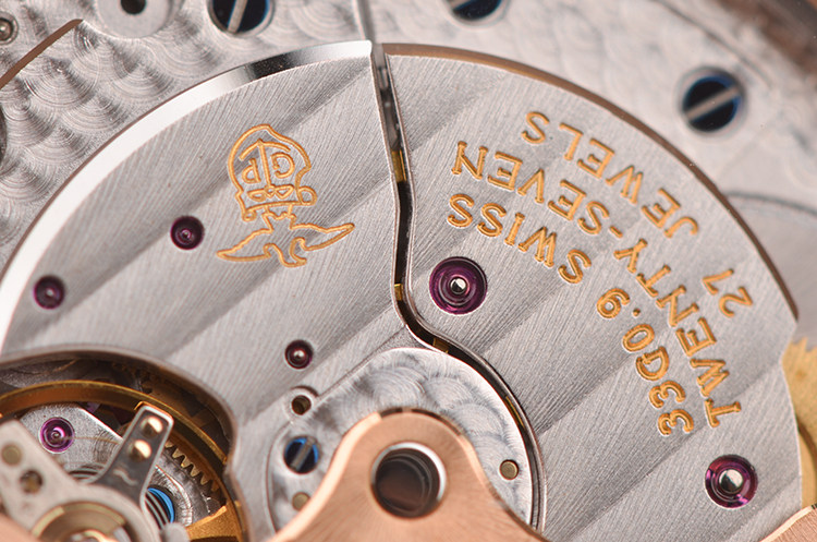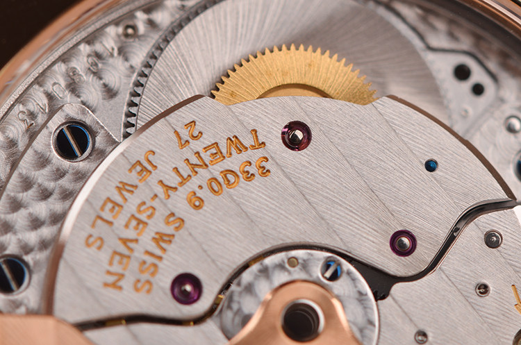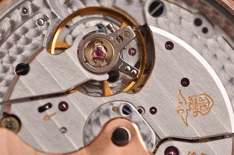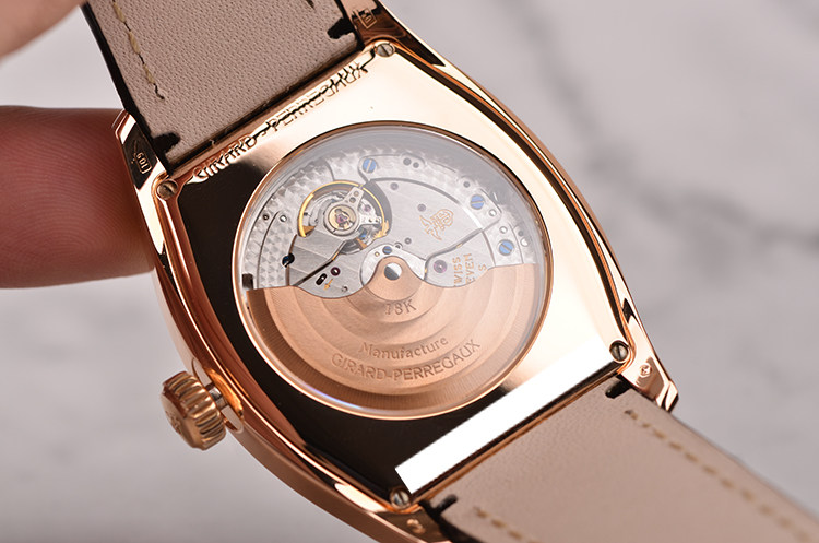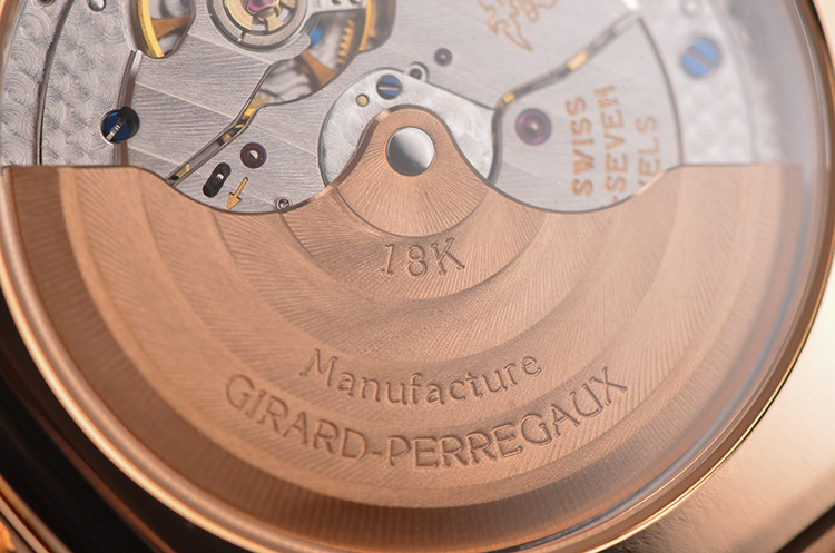 GP自产CAL.033G0.9型机芯,自动机械,极其精致日内瓦条纹打磨,倒角抛光修饰,18K玫瑰金自动转陀,27钻,摆频28800,动力储存约46小时,走时状态极嘉。