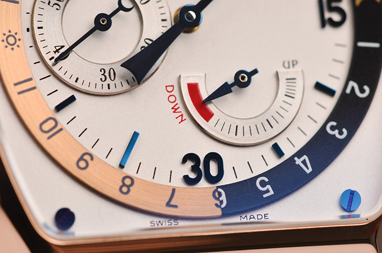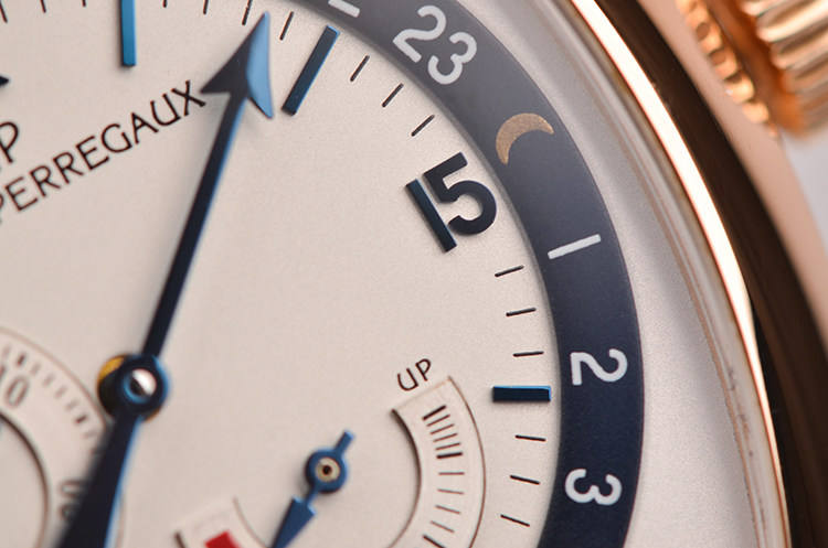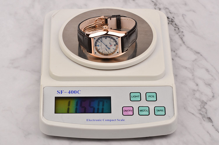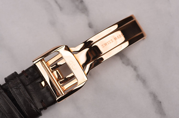 18K玫瑰金表壳及折叠式表扣,圣伯纳狗头印记。后配全新深棕色鳄鱼皮表带。蓝宝石水晶镜面及底盖,立体白色表盘,蓝钢指针,12点位箭头搭配双色昼夜显示表圈,4至6点位指针式动能储备显示,9点位独立小秒针,口径49.4MM*37MM*11.5MM,相当于圆表41MM左右大小,防水30M。