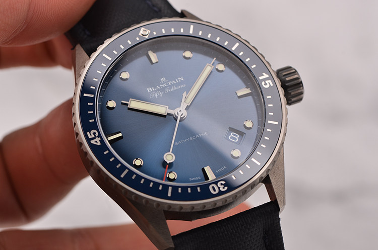 五十噚系列灰陶瓷蓝面43MM大三针日历自动机械男表