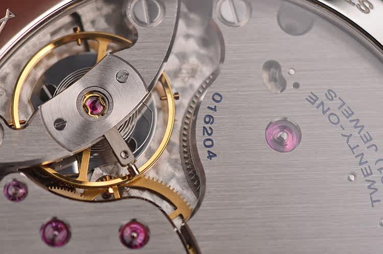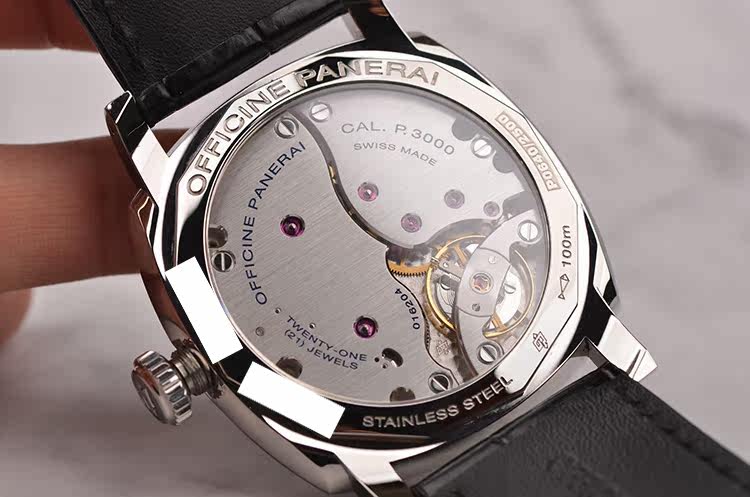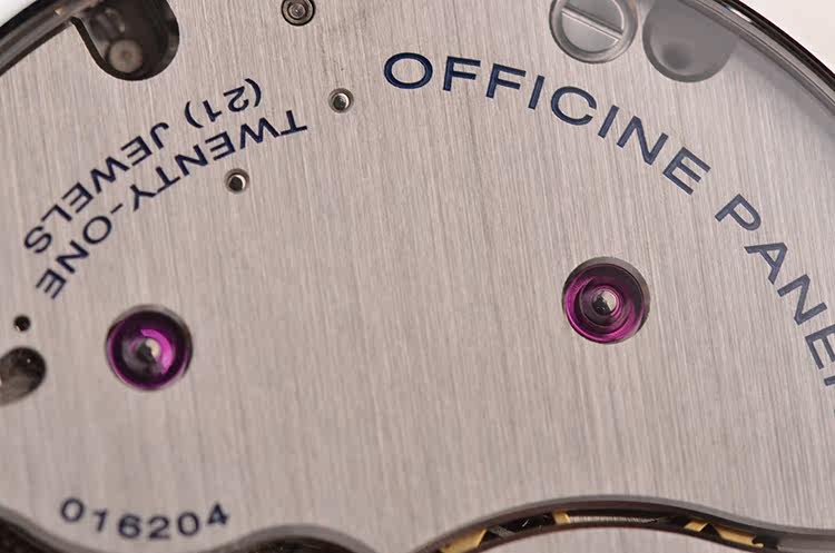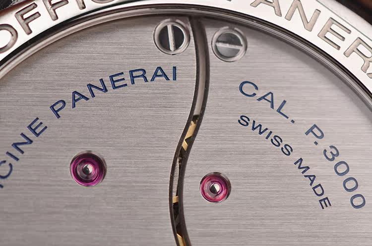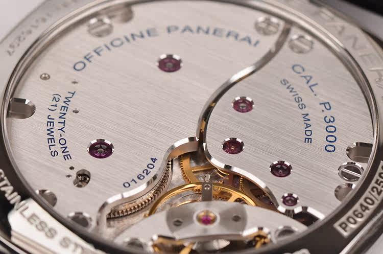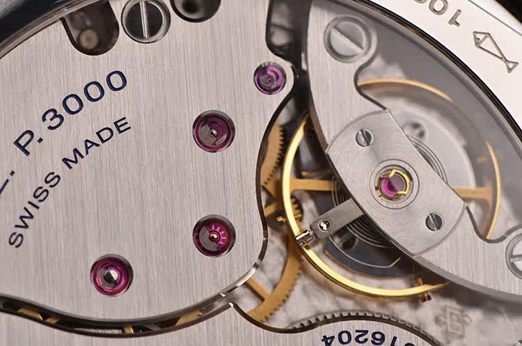 沛纳海自产CAL.P.3000型机芯,手上链,精致日内瓦条纹打磨,倒角抛光修饰。由162个零件组成,21钻,摆频21600,动力储存约72小时(3天链),走时状态极嘉。