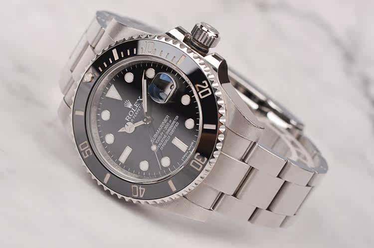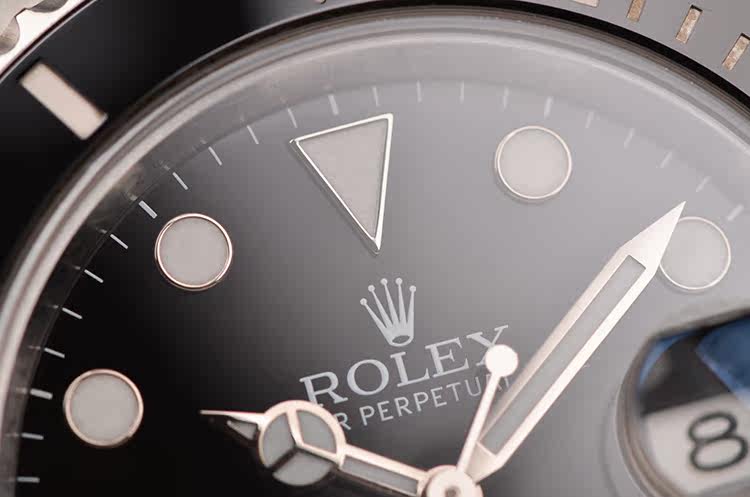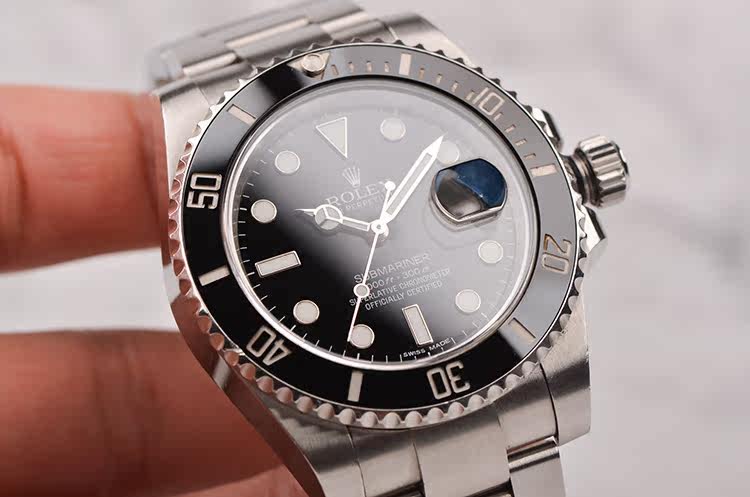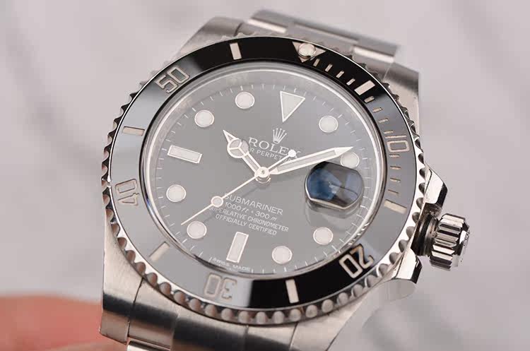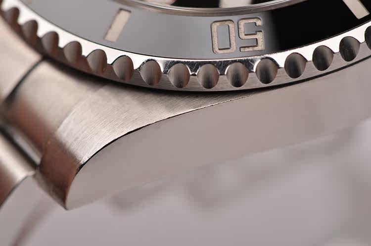 904L精钢表壳及链带,904L可微调折叠式搭扣。黑色陶瓷计时表圈。蓝宝石水晶镜面,立体黑色表盘,夜光奔驰指针及刻度,3点位放大镜日历视窗。旋入式防水表冠。口径40MM*13MM。防水300M。