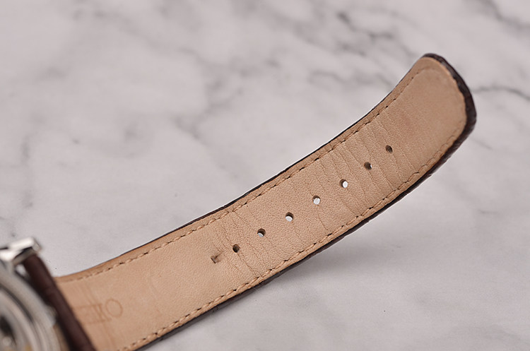 精钢表壳及按压式折叠表扣,原厂棕色鳄鱼皮表带成色很新。圆拱形蓝宝石水晶镜面及底盖,立体米黄色表盘,大三针设计,蓝钢秒针,3点位日历显示功能。口径39.5MM*13.1MM。防水30M。