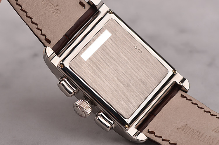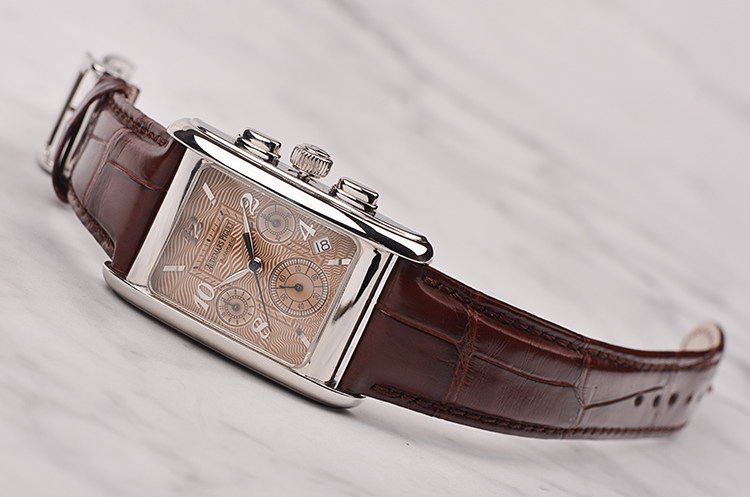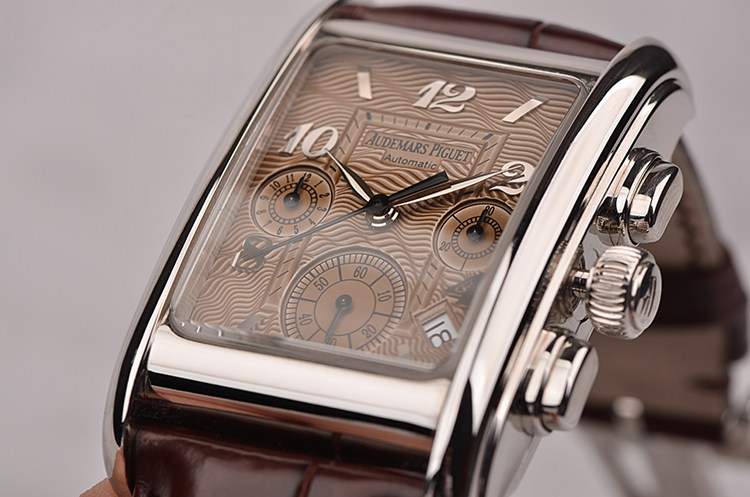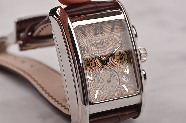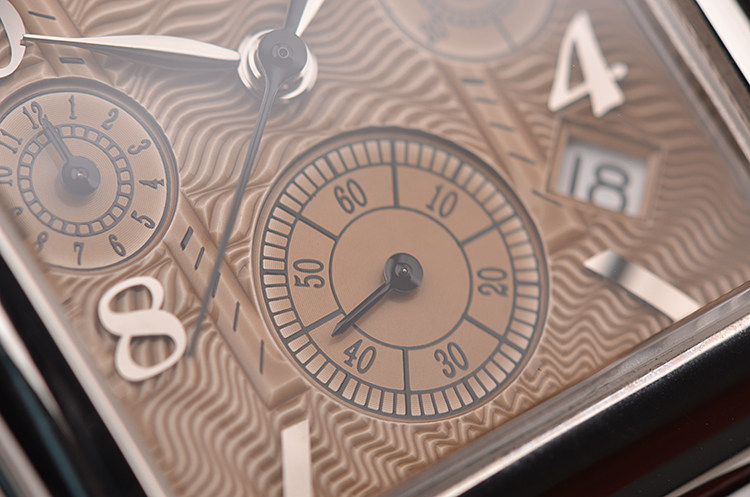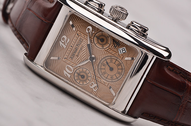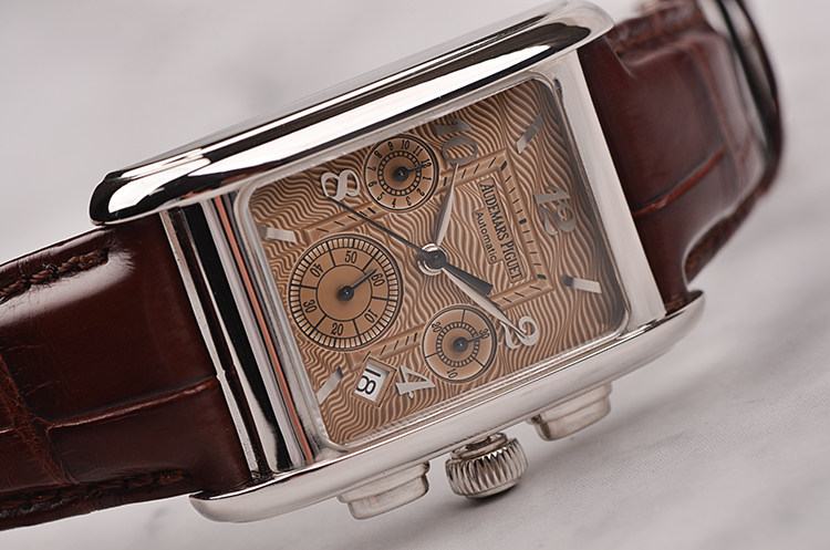 18K白金表壳及折叠式表扣,圣伯纳狗头印记。后配棕色鳄鱼皮表带成色极新。弧形蓝宝石水晶镜面,罕有立体浅棕色雕纹表盘,白金指针及刻度,3时位30分钟计时功能,9时位12小时计时功能,6时位独立小秒针。5时位日历显示功能。口径49MM*29MM*12MM,相当于圆表40MM左右大小。防水20M。