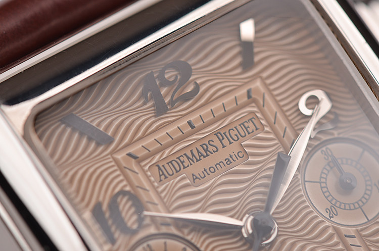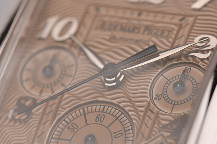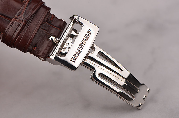 AP自产CAL.2385型机芯,自动机械,计时,日历显示功能。极其精致日内瓦条纹打磨,倒角抛光修饰,由304个零件组成,37钻,摆频21600,动力储备约40个小时,走时状态极嘉。