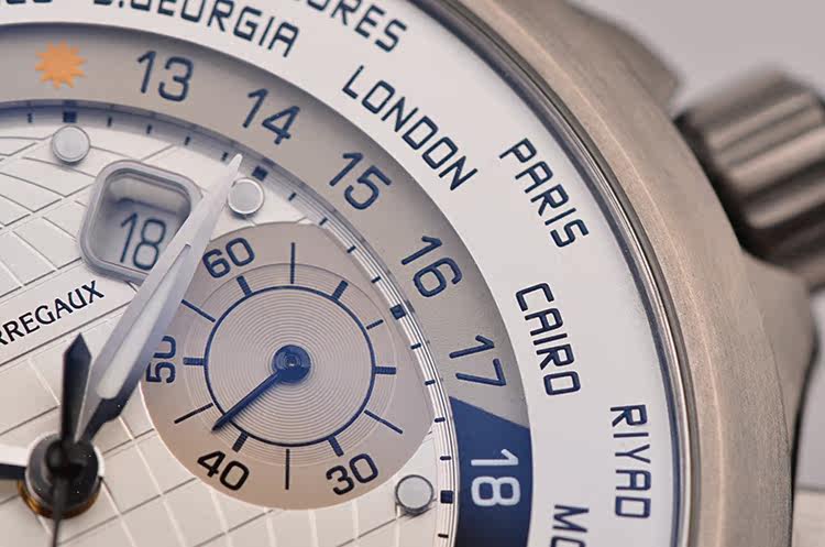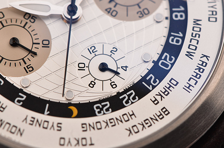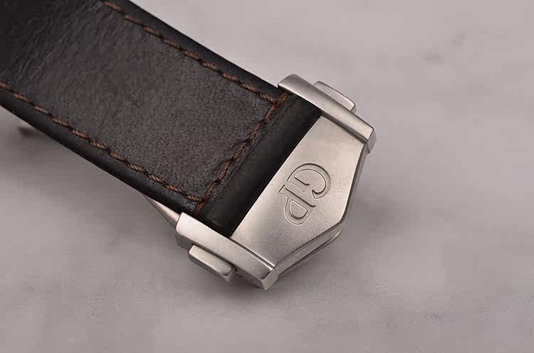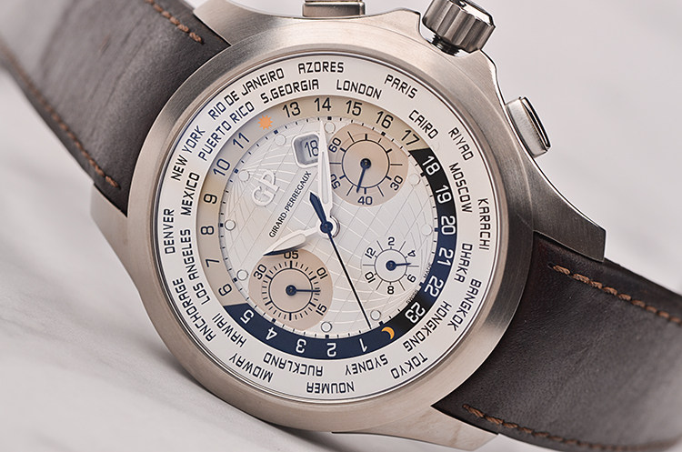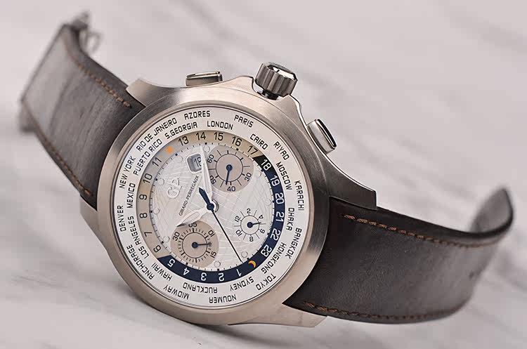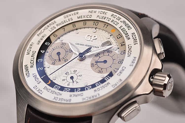 钛合金表壳及按压式折叠表扣,原装深棕色真皮内衬橡胶表带成色极新。蓝宝石水晶镜面及底盖,立体银白色计时表盘,世界时间,昼夜显示,计时,日历多重功能。夜光圆点刻度及时分针,口径44MM*13.65MM。旋入式防水表冠,防水100M。