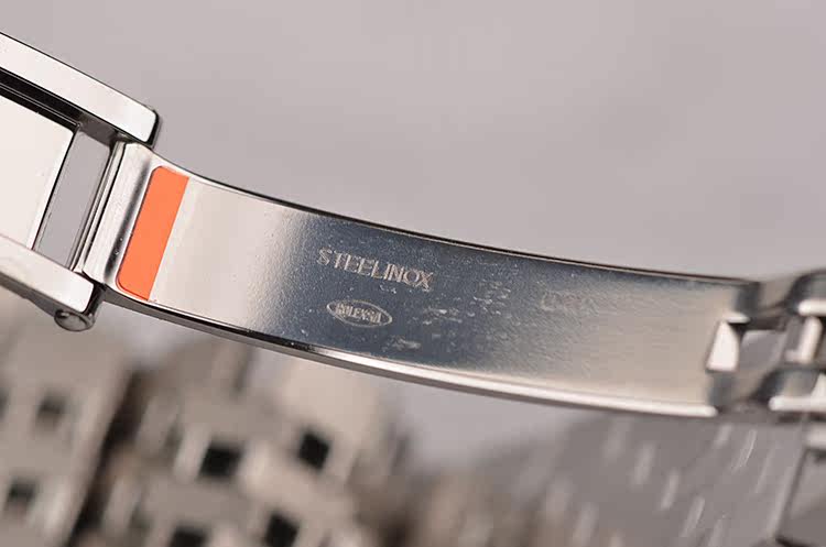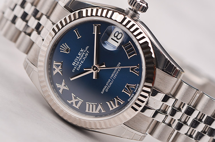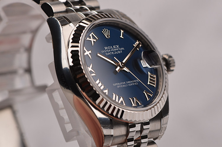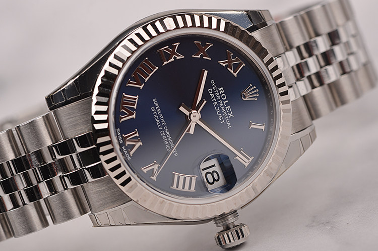 18K白金三角坑纹表圈及精钢表壳,精钢五株链带及折叠式表扣。蓝宝石水晶镜面,立体蓝色表盘,罗马数字刻度,3点位放大镜日历窗口。旋入式防水表把。口径31MM*11.4MM。防水100M。