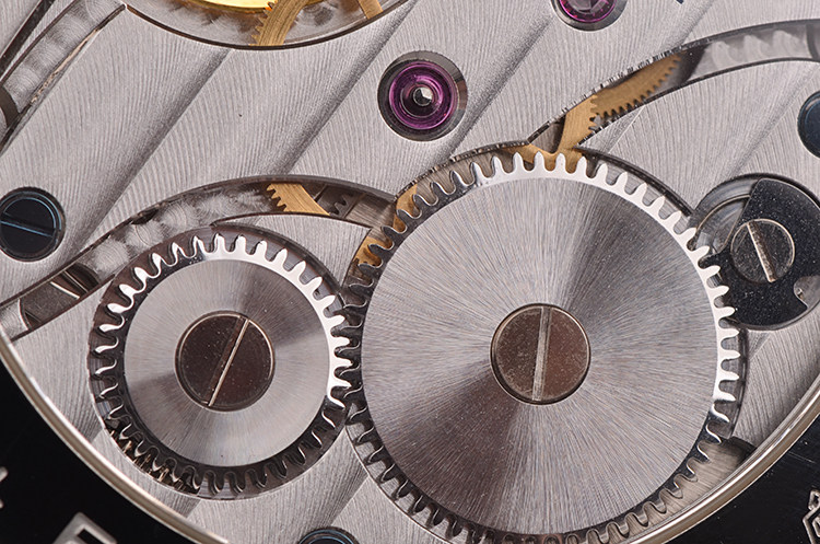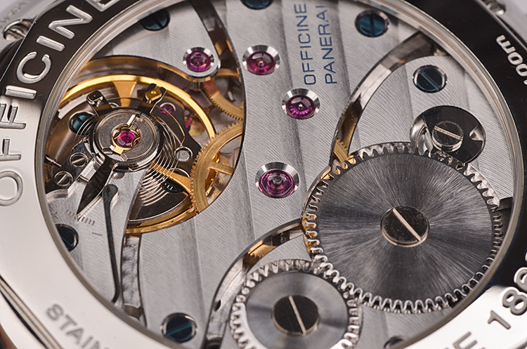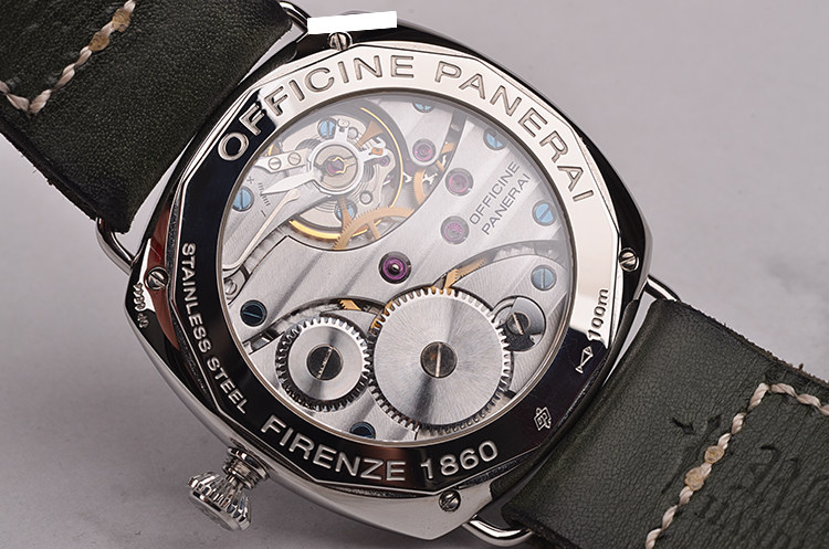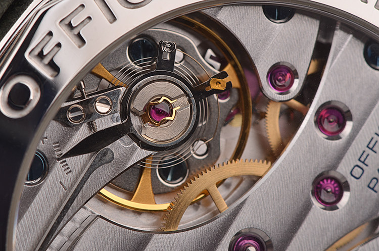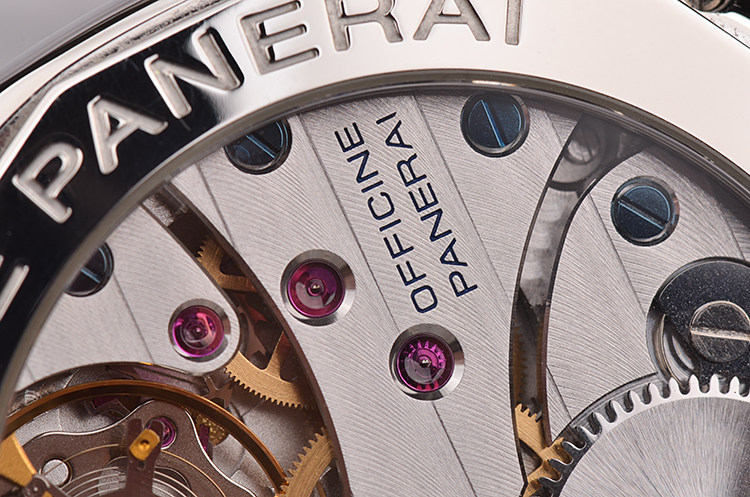 沛纳海OPXI机芯,手动上链,精致的日内瓦条纹打磨及倒角抛光修饰。天文台认证,17钻,摆频21600。大夹板机芯,鹅颈微调功能。动力储存约56小时,走时状态极嘉。