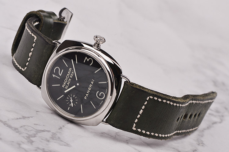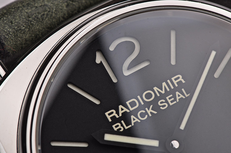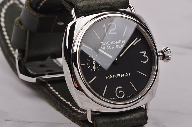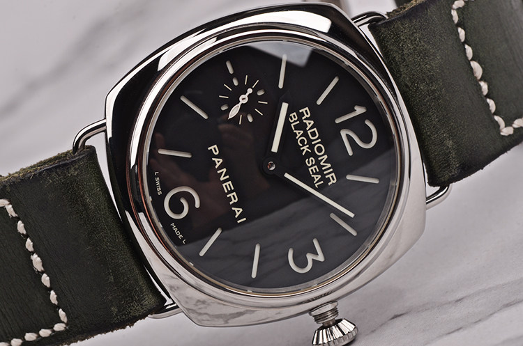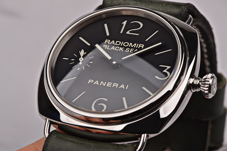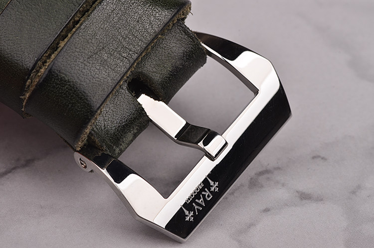 精钢表壳,后配Ray精钢表扣,后配Ray军绿色牛皮表带成色极新。蓝宝石水晶镜面及底盖。黑色三明治表盘,夜光刻度及指针。口径45MM*13.5MM,旋入式防水表冠,防水100米。