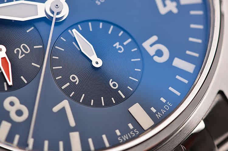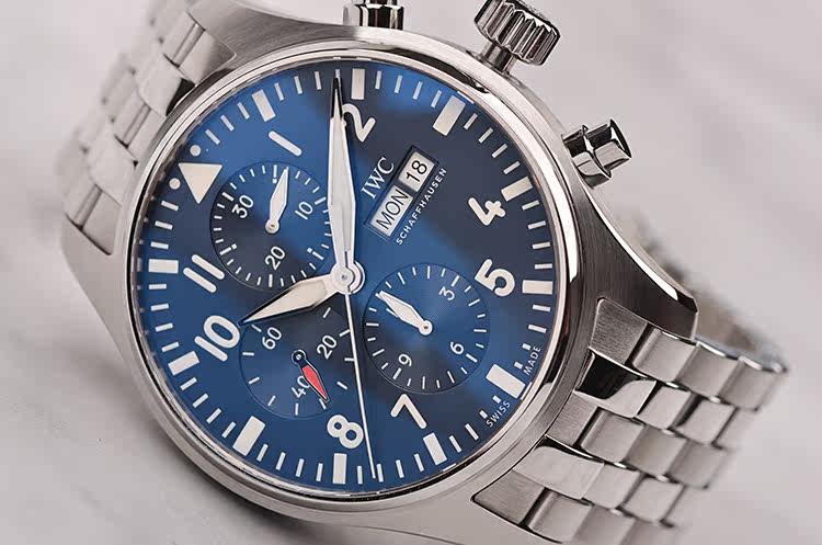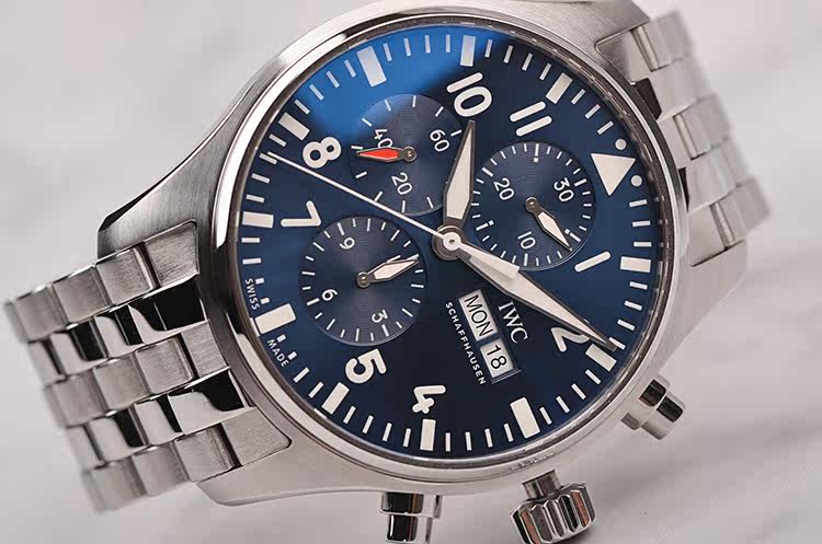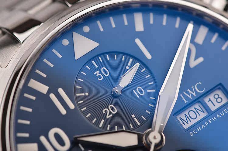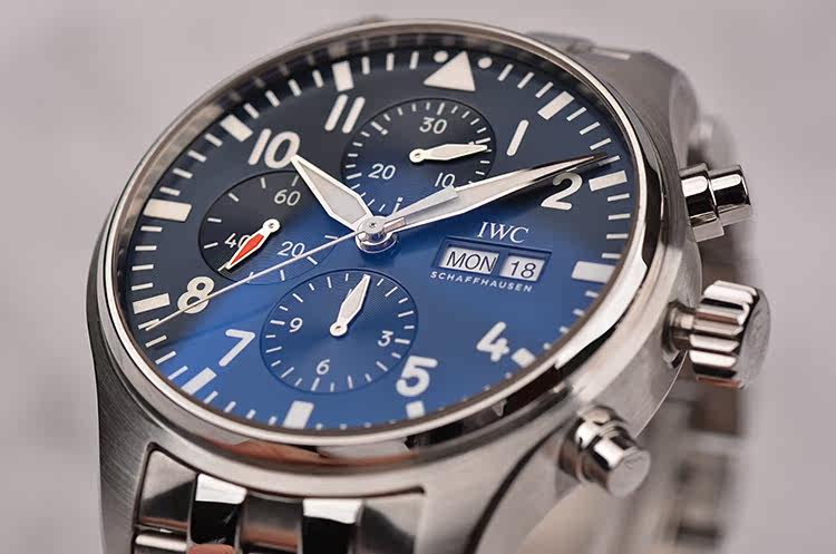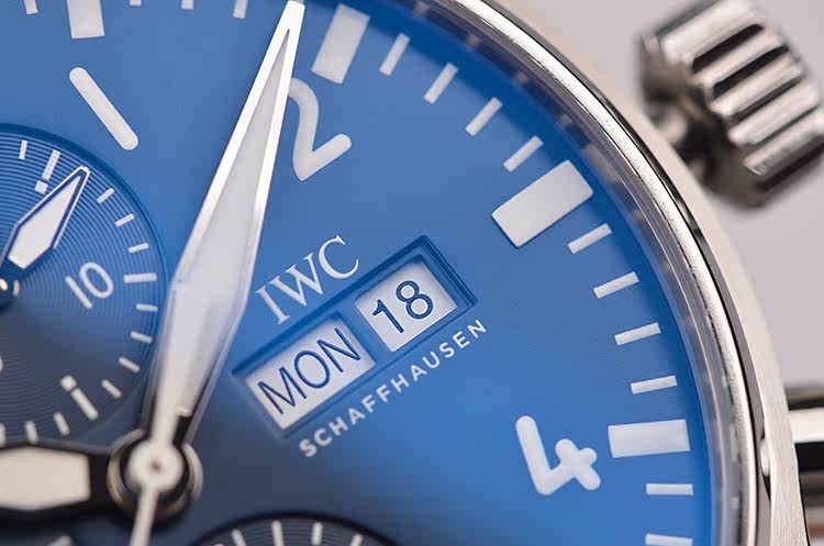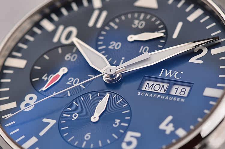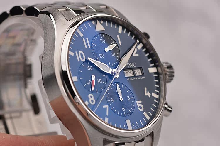 万国CAL.79320型机芯,自动机械,计时、星期、日历功能,精致日内瓦条纹打磨,由240个零件组成,25钻,摆频28800,动力储存约44小时,走时状态极嘉。