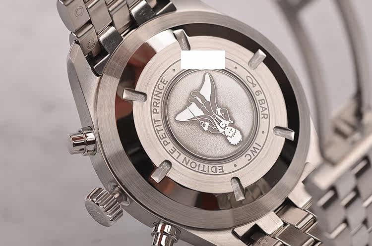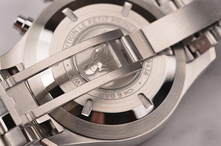 精钢表壳及链带,按压式可微调折叠表扣。抗反光涂层蓝宝石水晶镜面,立体蓝色计时表盘,夜光刻度及指针,12点位30分钟计时,3点位星期及日历窗口,6点位12小时计时,9点位红色独立小秒针。底盖上镌刻有《小王子》的精美画像。旋入式防水表冠。口径43MM*15.4MM。防水60M。