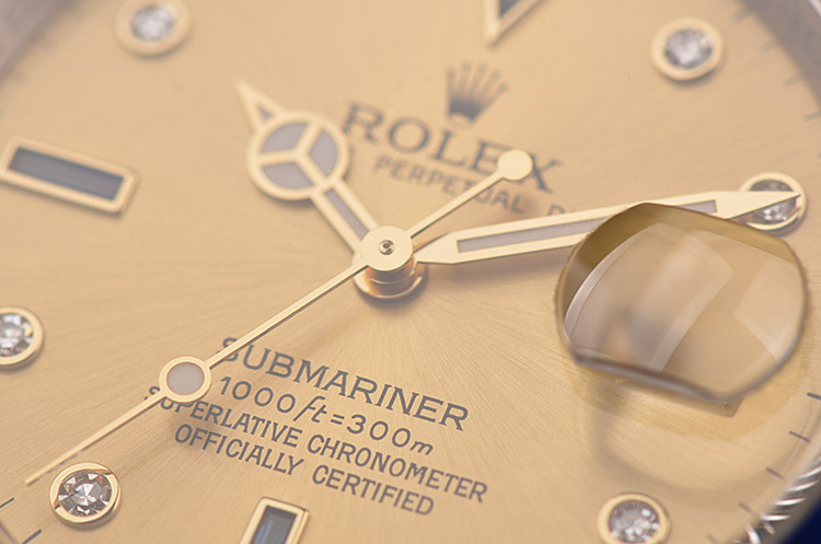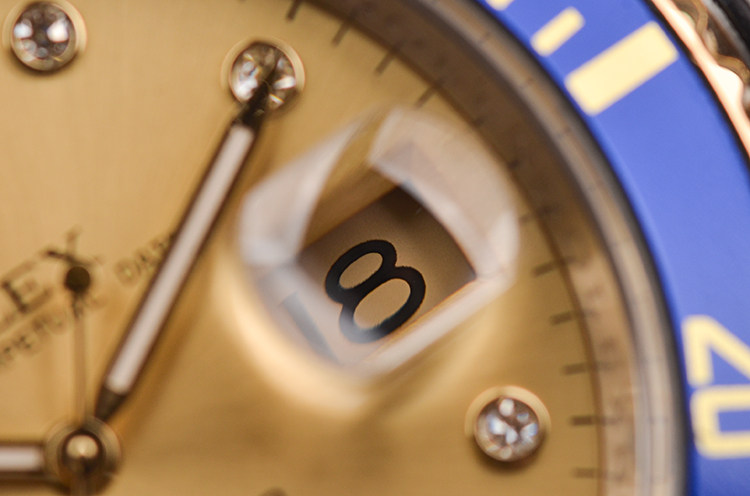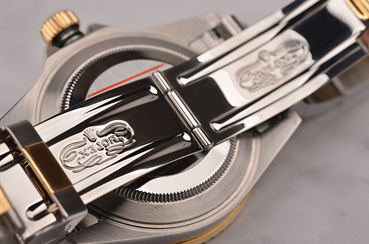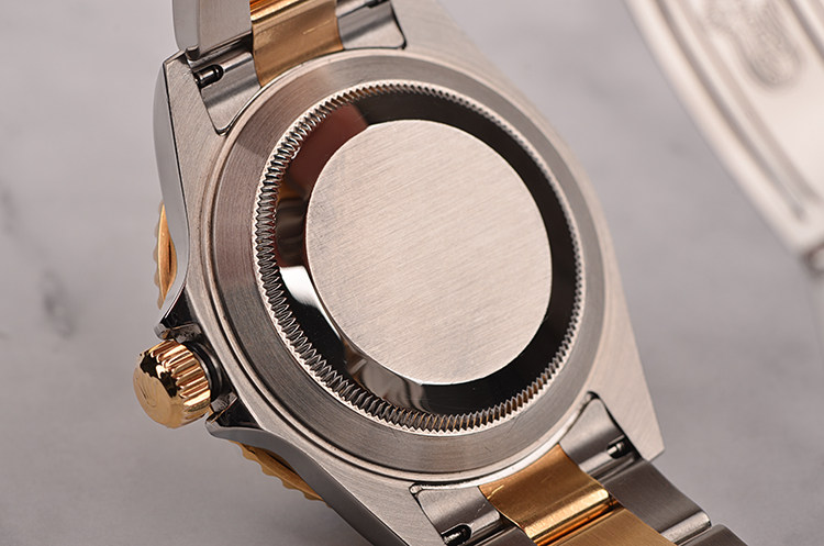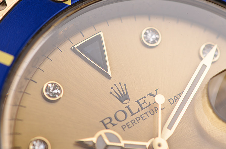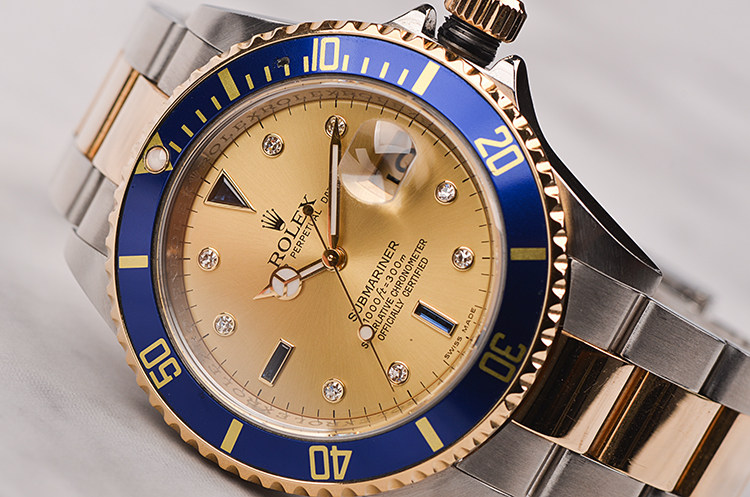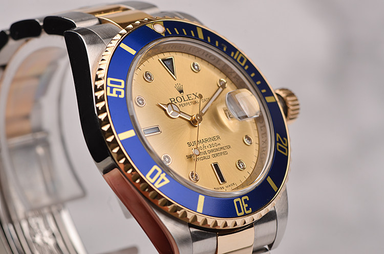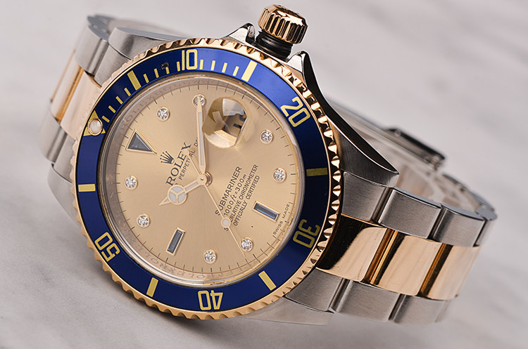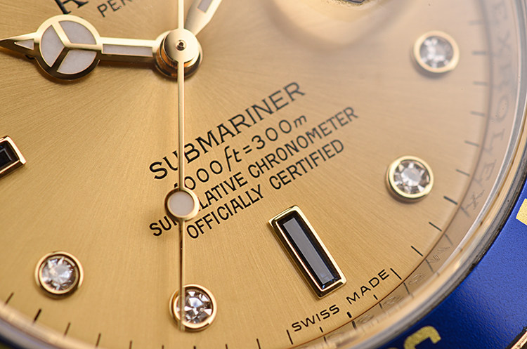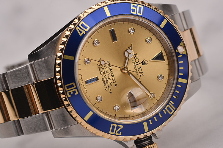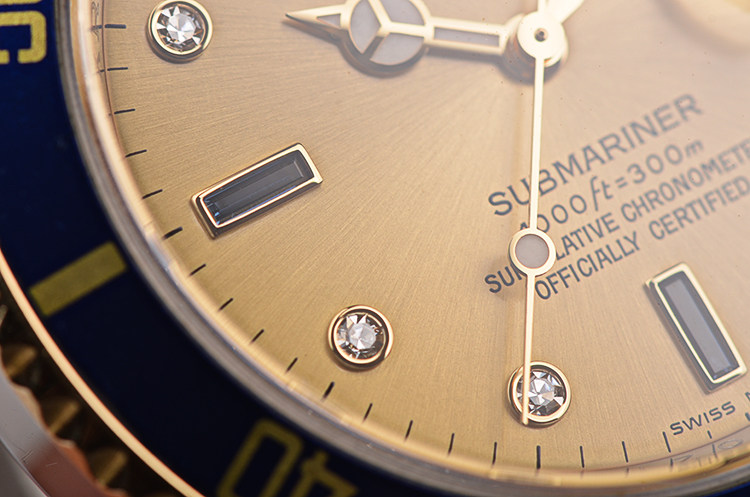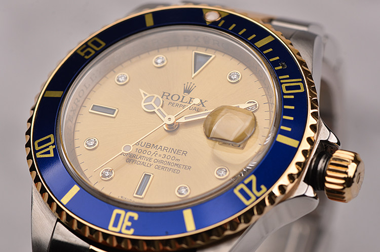 潜航者型黄金及钢蓝圈金色面蓝宝石及钻石刻度自动男表