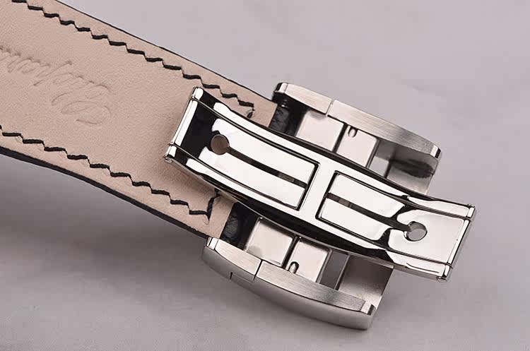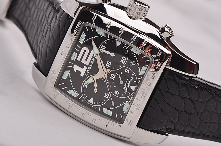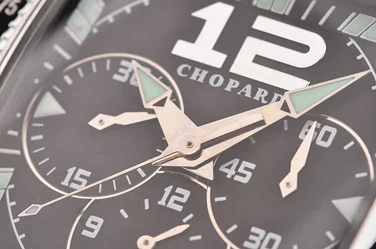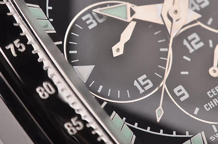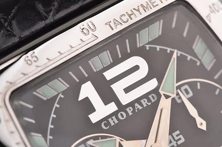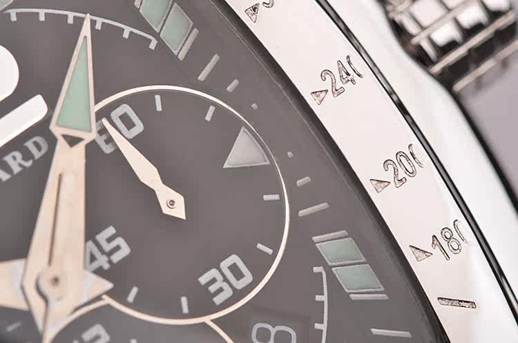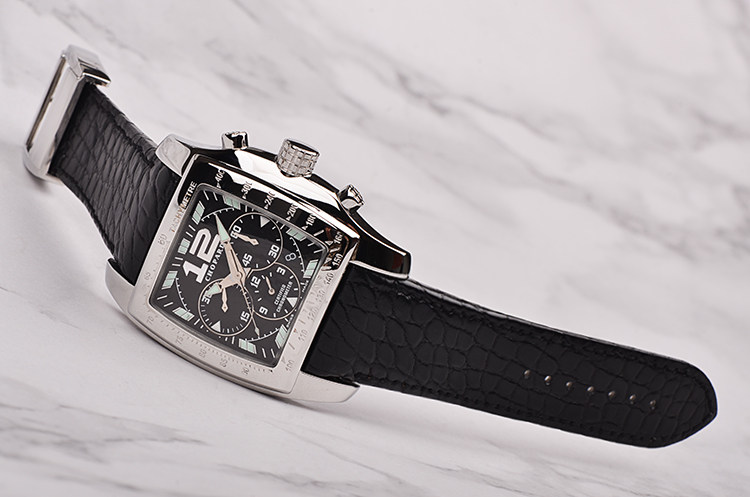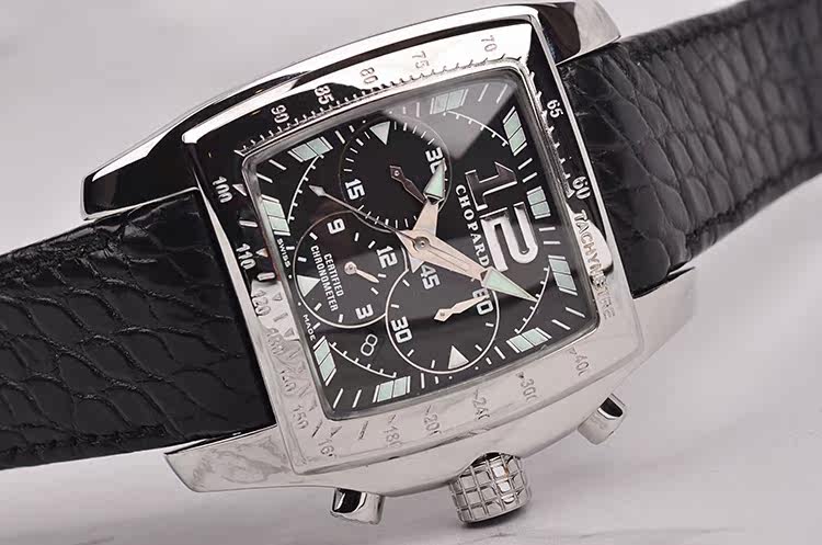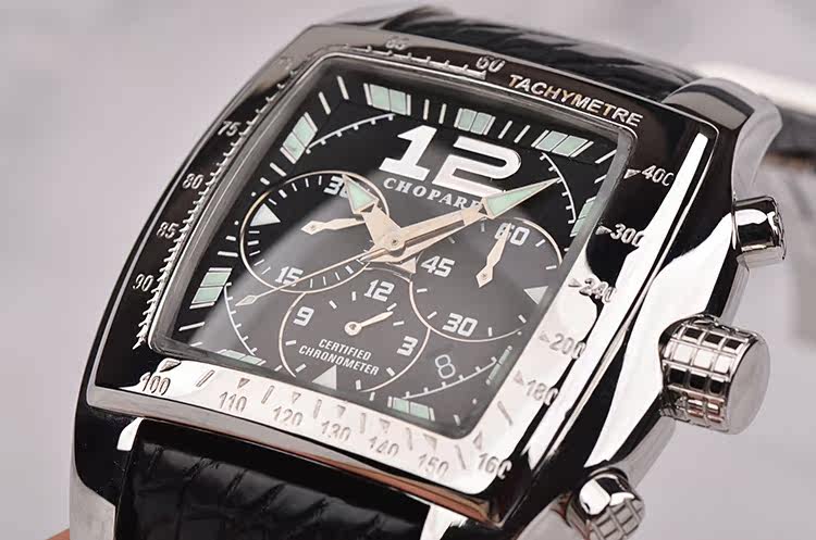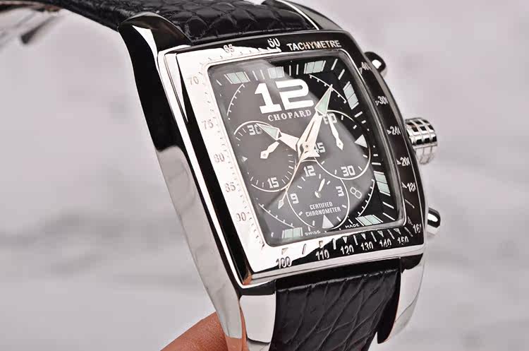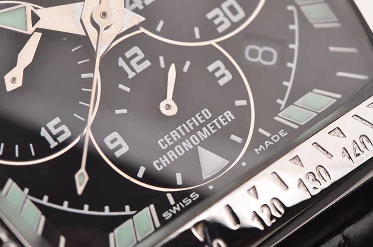 精钢表壳及双向折叠表扣,后配全新黑色鳄鱼皮表带。蓝宝石水晶镜面,立体黑色计时表盘,测速计表圈,夜光刻度及指针,3点位独立小秒针,4至5点位间日历窗口,6点位12小时计时,9点位30分钟计时。天文台认证标示,口径59.7MM*46MM*13MM。相当于圆表47MM左右大小,防水50M。