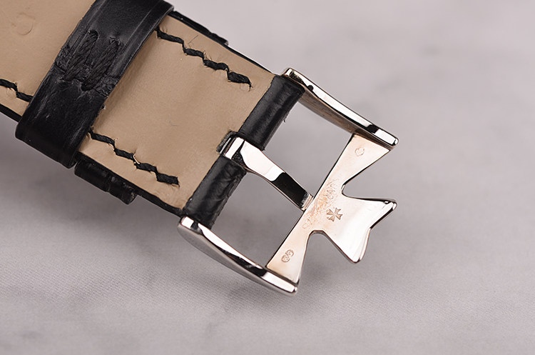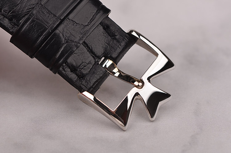 18K白金表壳及表扣,圣伯纳狗头印记。后配全新黑色鳄鱼皮表带。表框原厂镶嵌50颗hao华天然美钻(共计1.72克拉),弧形蓝宝石水晶镜面,立体黑色表盘,白漆字罗马刻度,白金指针。口径36.7MM*26.2MM*7.2MM。相当于圆表34MM左右大小,防水30M。
