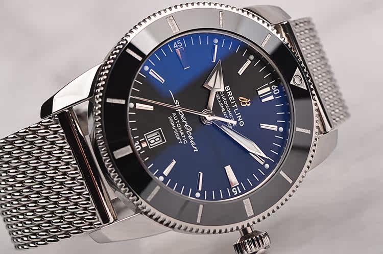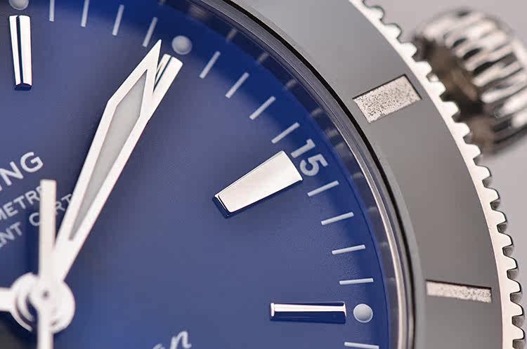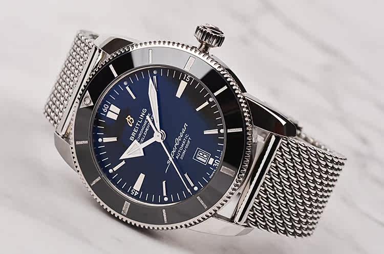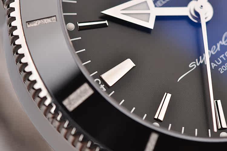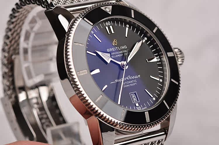 精钢表壳及精钢编织链带,可微调双保险折叠表扣。蓝宝石水晶镜面,黑陶瓷单向可旋转表圈,立体黑色表盘,大三针设计,夜光圆点时标及时分针,6点位日历窗口,天文台认证标识。旋入式防水表冠。口径46MM*15MM,防水200M。