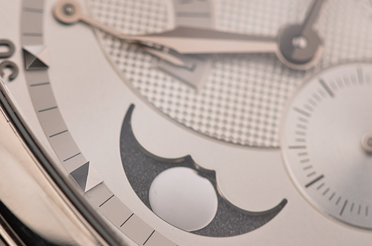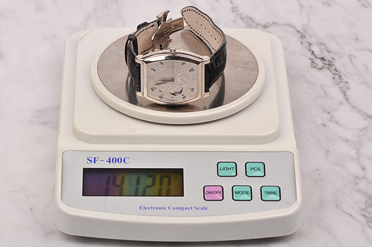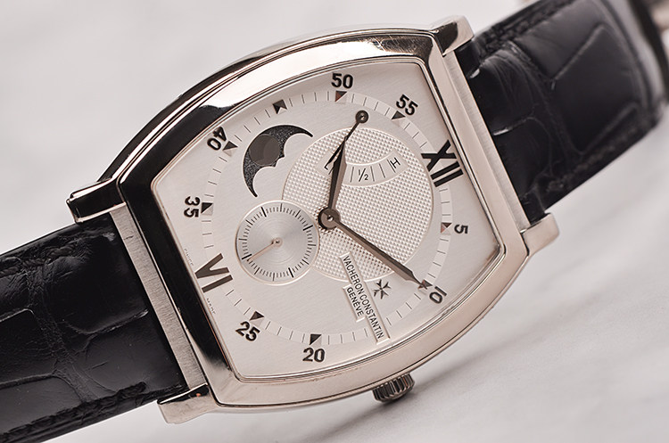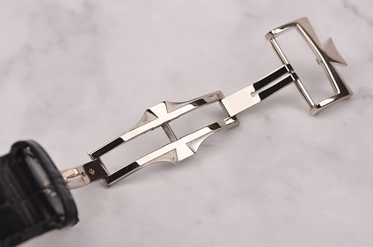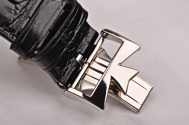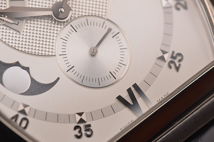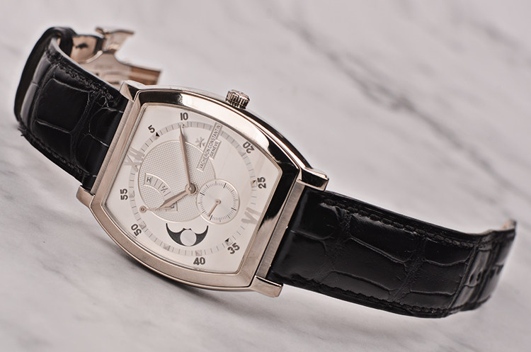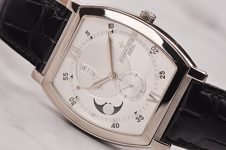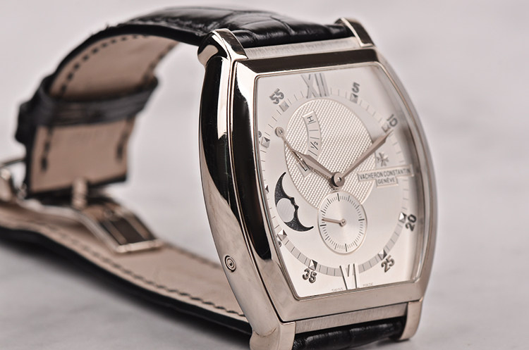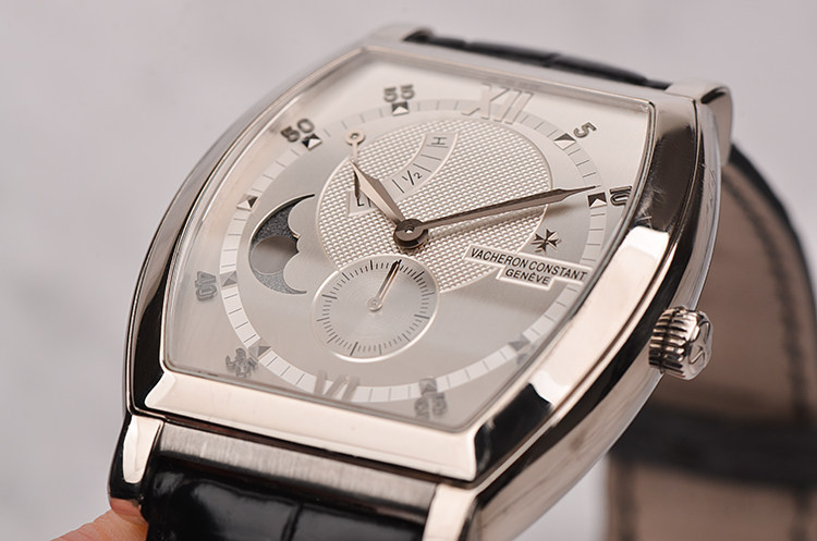 18K白金酒桶型表壳及双向折叠式表扣,圣伯纳狗头印记。原厂黑色鳄鱼皮表带成色极新。蓝宝石水晶镜面,立体银白色雕花表盘,白金刻度及指针,10至11点位指针式动能储备显示,8至9点位月相功能,6点位独立小秒针。口径49MM*39MM*13MM,相当于圆表43MM左右大小。防水30M。