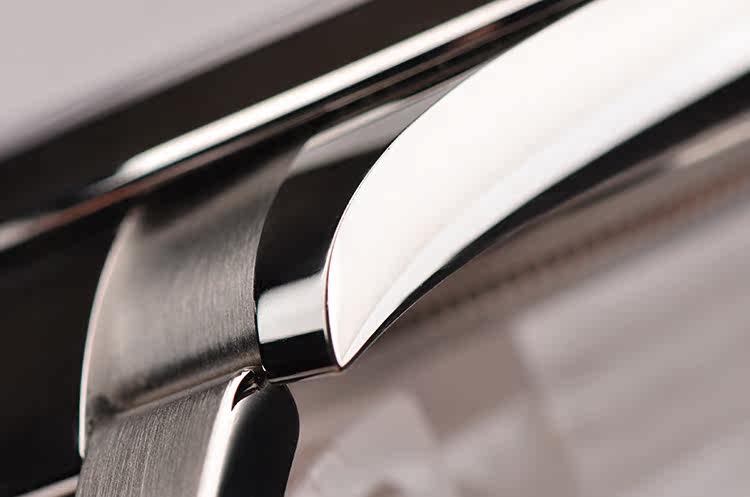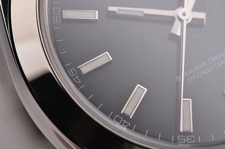 904L精钢表壳及链带,折叠式表扣。蓝宝石水晶镜面,立体黑色表盘,白金夜光刻度及时分针,3点位放大镜日历视窗。口径41MM*12.8MM,旋入式防水表冠。防水100M。