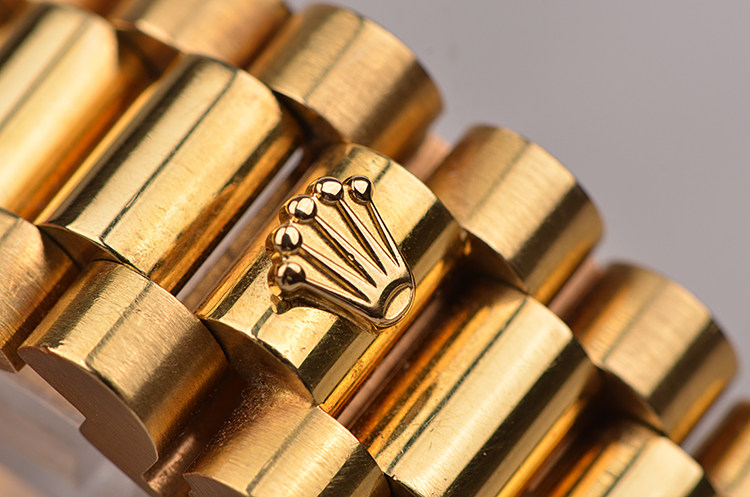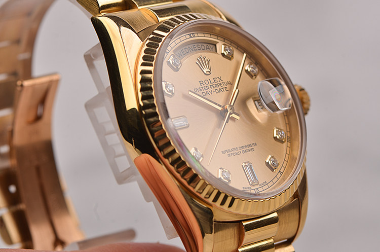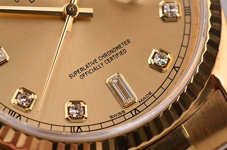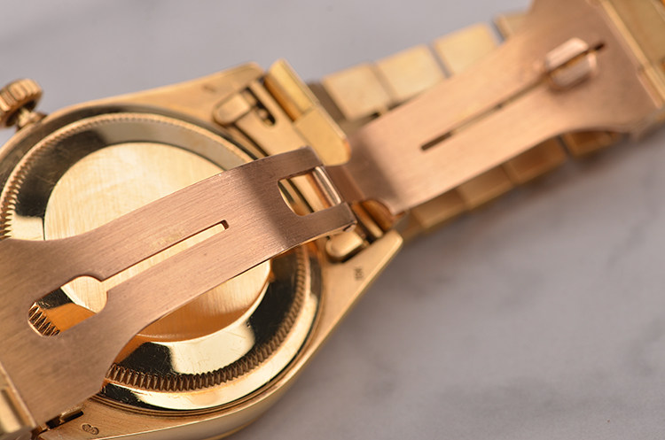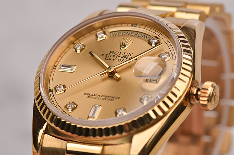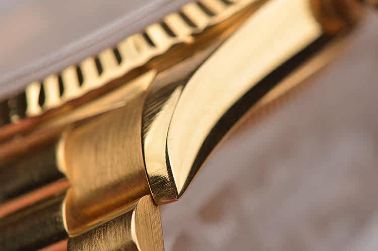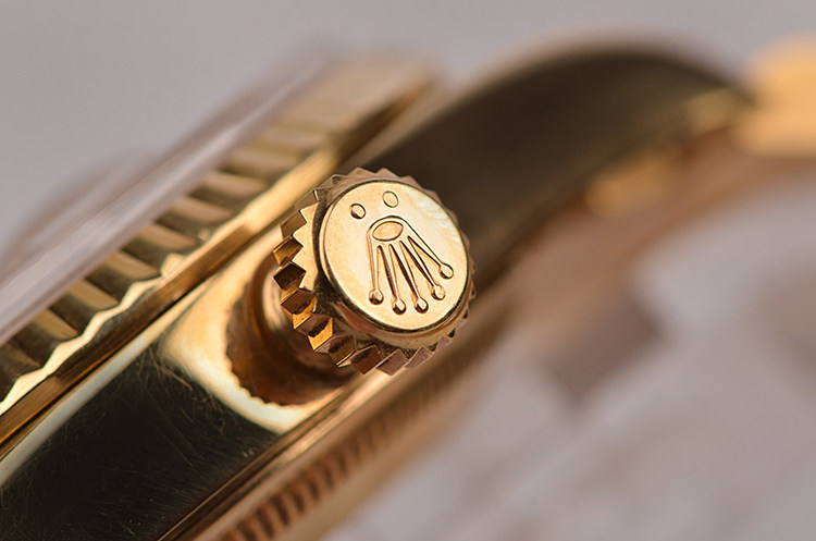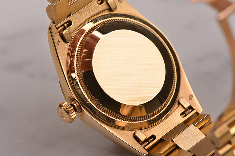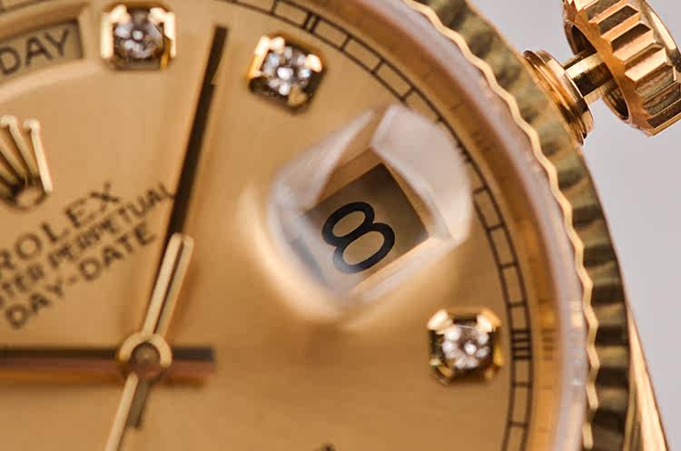18K黄金表壳及链带,18K黄金折叠式表扣,女皇头印记。18K黄金三角坑纹表圈,立体金色表盘,10颗原厂大包钻石时标(其中6点与9点位为长条钻)。黄金指针,12点位星期显示功能,3点位放大镜日历视窗,旋入式防水表冠。口径36MM*12MM。防水100M。