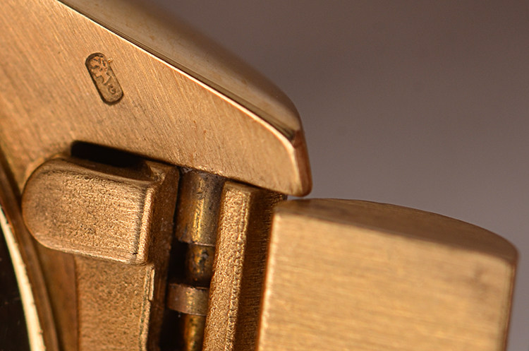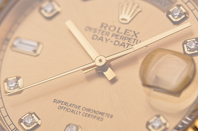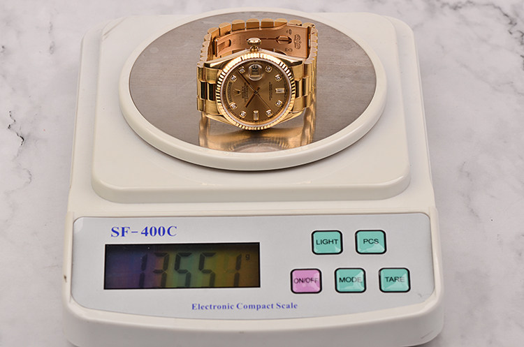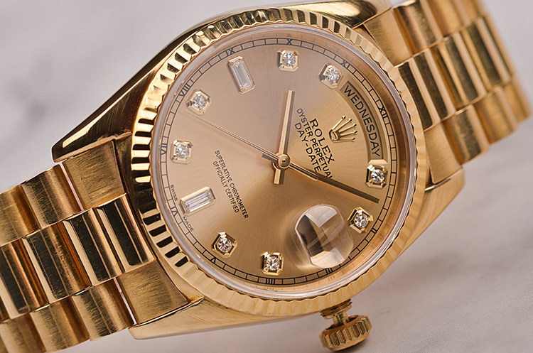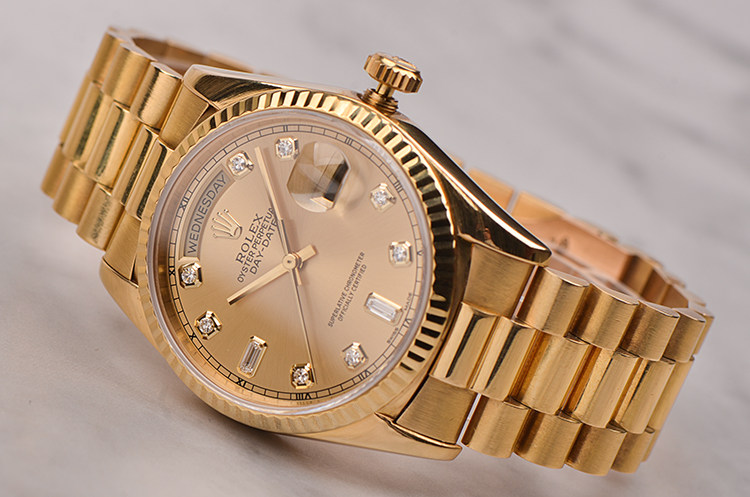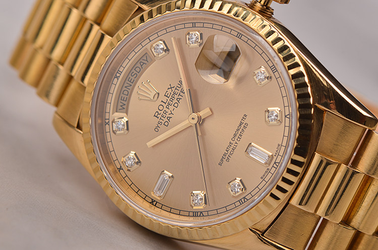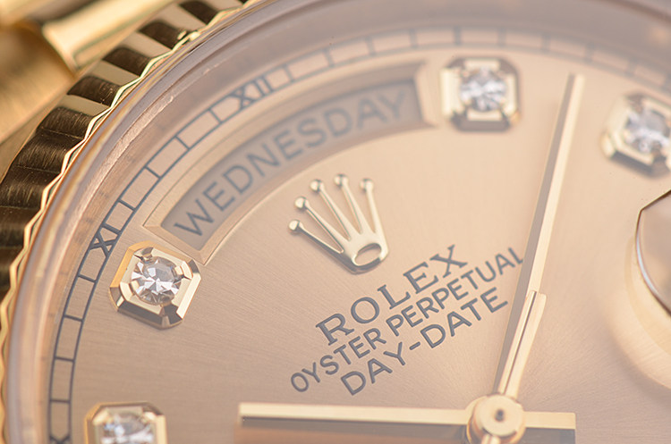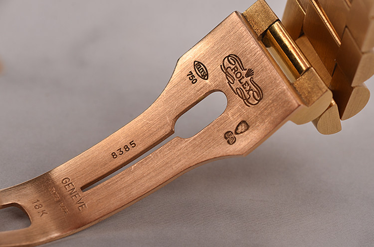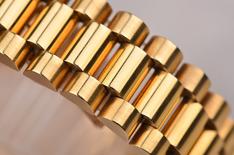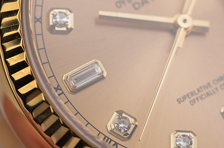18K黄金表壳及链带,18K黄金折叠式表扣,女皇头印记。18K黄金三角坑纹表圈,立体金色表盘,10颗原厂大包钻石时标(其中6点与9点位为长条钻)。黄金指针,12点位星期显示功能,3点位放大镜日历视窗,旋入式防水表冠。口径36MM*12MM。防水100M。