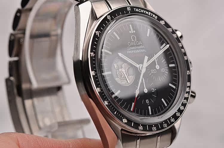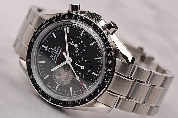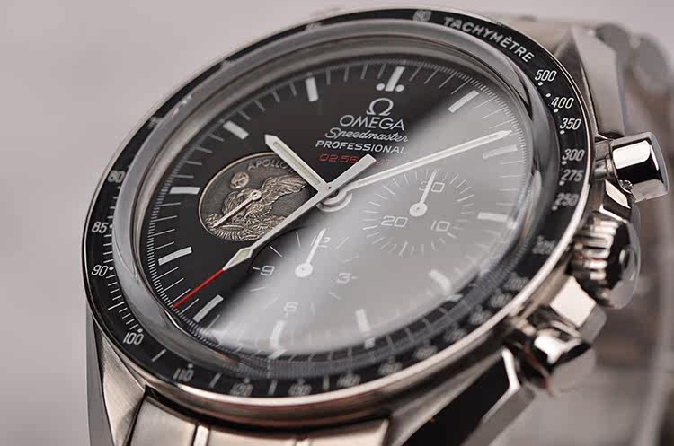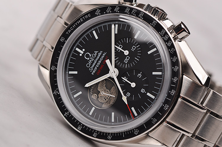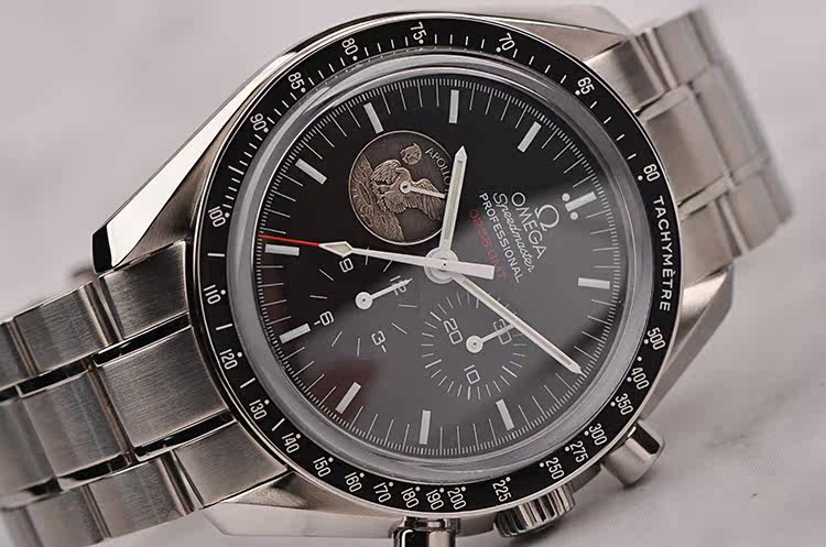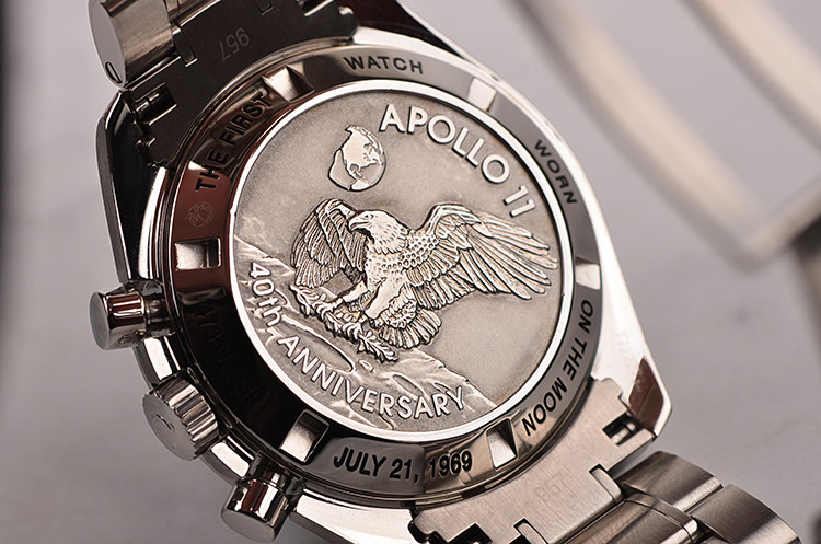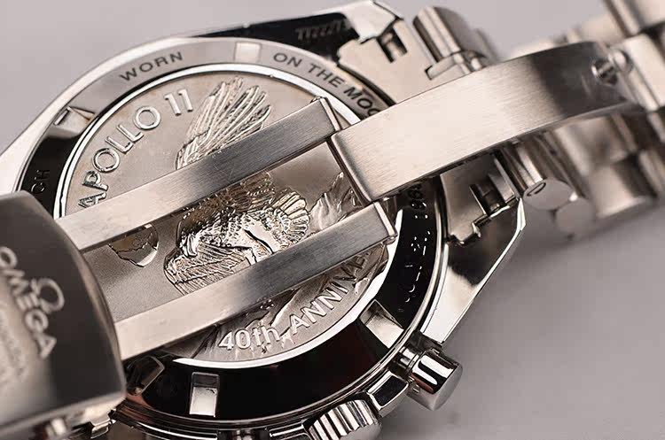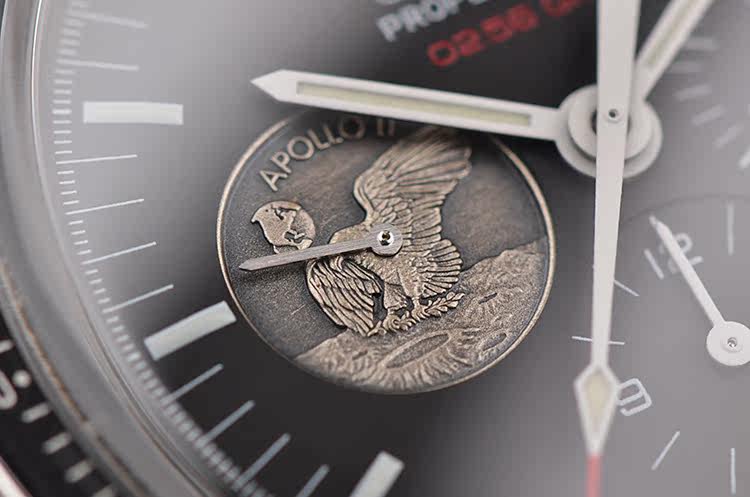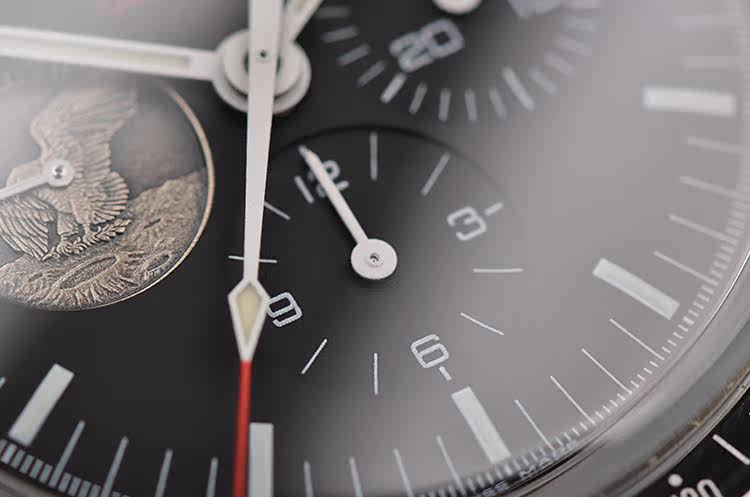 表盘:黑色表盘,9点位小秒针为阿波罗11号任务奖章,夜光刻度及指针,雕刻底盖,刻印限量编号。