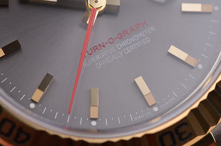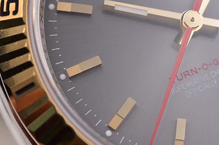 表盘:立体深灰色表盘,黄金刻度及指针,红色秒针