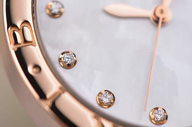 表盘:立体银白色珍珠贝母表盘,12颗钻石时标