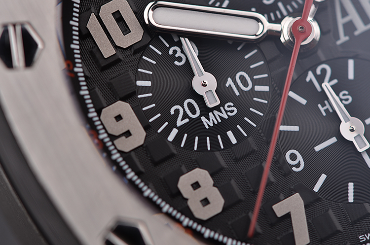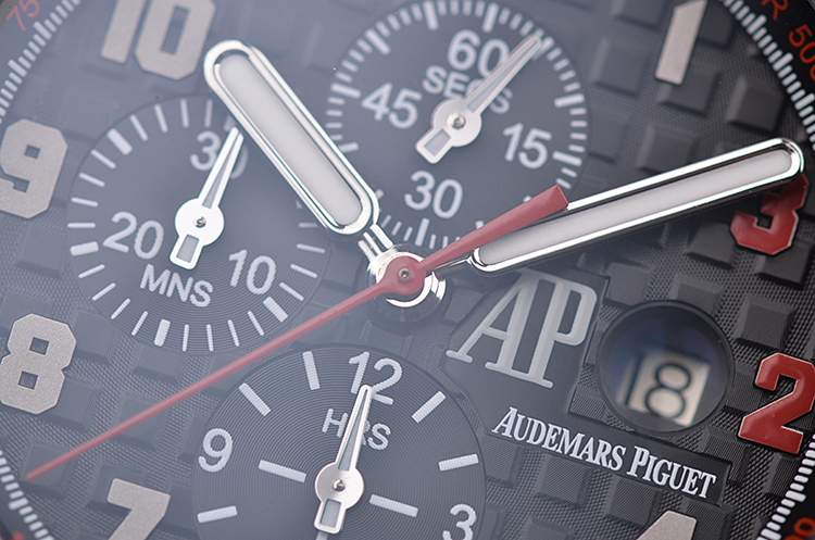 表盘:立体黑色华夫格计时表盘,红色3,2倒挂时标
