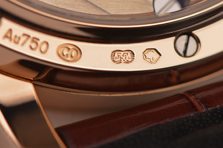 18K玫瑰金表壳及表扣,圣伯纳狗头印记。后配全新棕色鳄鱼皮表带。蓝宝石水晶镜面及底盖,立体银白色表盘,玫瑰金指针及刻度,时分针及动显指针有夜光,偏心小三针设计,4点位月相及独立小秒针,2点位大日历视窗,指针式动能储备显示功能。口径38.5MM*10.4MM,防水30M。