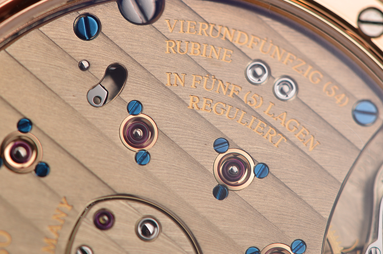 A. Lange & Sohne自产的Cal.L901.5型机芯,手上链,标准德式3/4大夹板机芯,德国银材质,极其精致人手打磨,倒角抛光修饰,蓝宝石固定红宝石轴承,黄金套筒,雕花鹅颈微调夹板,汇集德式高级制表所有元素。由高达398个零件组成,54钻,摆频21600,5方位校正,动力储存约72小时,3天链,走时状态极嘉。