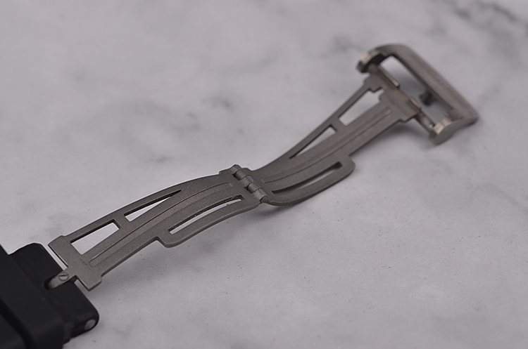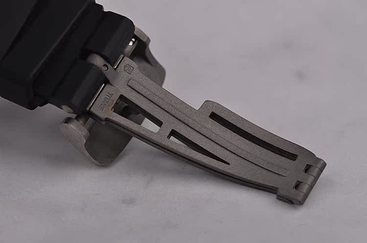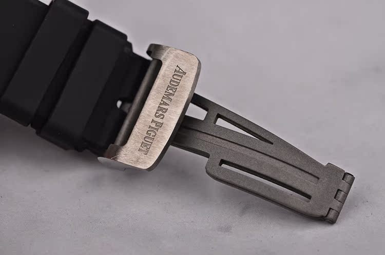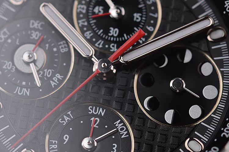 钛合金八角皇家橡树表壳及折叠式表扣,原厂黑色胶带成色极新。蓝宝石水晶镜面,前后盖白金螺丝,立体黑色方格纹万年历月相计时表盘,白金夜光刻度及时分针,12点位小秒针及指针式日历,3点位指针式月龄月相,6点位12小时计时及星期显示,9点位30分钟计时,闰年及月份显示。旋入式防水表冠,口径42MM*15.9MM。防水100M。