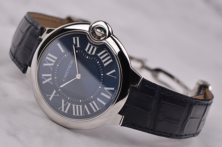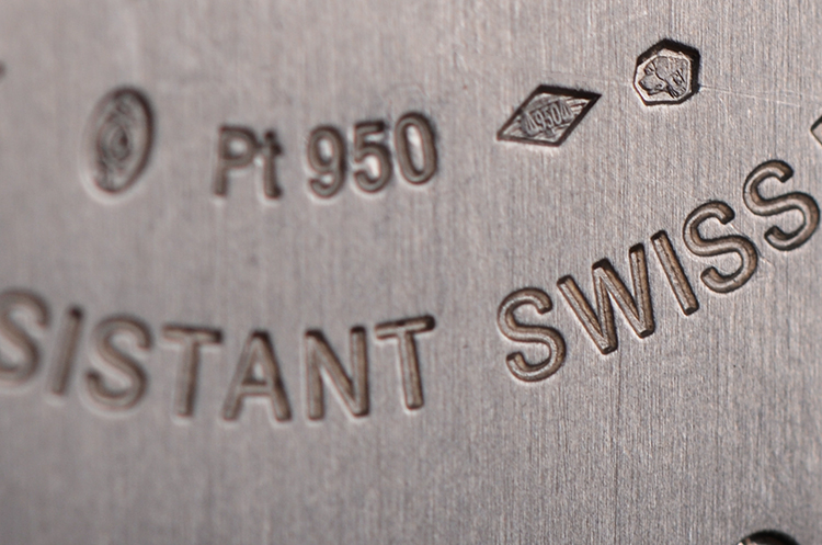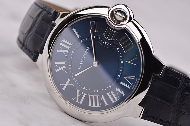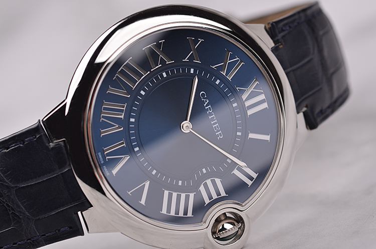PT950铂金表壳及折叠式表扣,圣伯纳狗头印记。原厂深蓝色鳄鱼皮表带成色较新。蓝宝石水晶镜面,立体蓝色旭日纹表盘,白金罗马数字刻度及指针,蓝宝石表冠。口径46MM*7MM(超薄厚度)。防水30M。