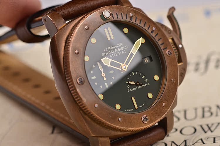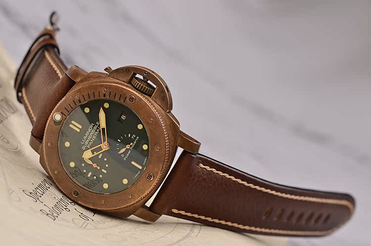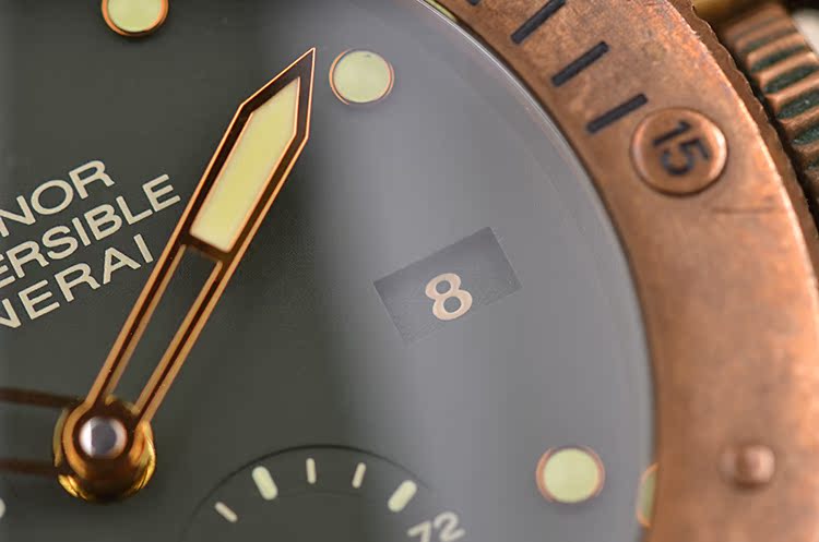 青铜表壳(已自然氧化),钛合金底盖,精钢表扣。原厂深棕色牛皮表带成色全新,另有一条“RAY”牛皮表带及表扣成色极新(原表主一直使用替换表带,原装带未使用)。由刚玉制成的蓝宝石水晶镜面及底盖,青铜单向可旋转计时表圈,立体深绿色表盘,夜光刻度及指针。3点位日历窗口,4至6点位间指针式动能储备显示,9点位独立小秒针。表冠护桥装置。口径47MM*17.8MM。防水300M。