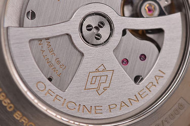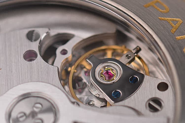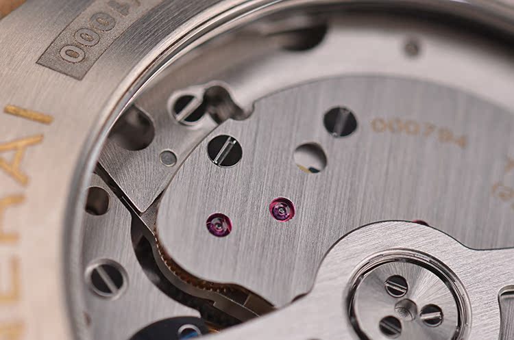 沛纳海自产的P.9002型机芯,自动机械,精致日内瓦条纹打磨,倒角抛光修饰,由237个零件组成,29钻,摆频28800,动力储备约72小时(3天链)。走时状态极嘉。