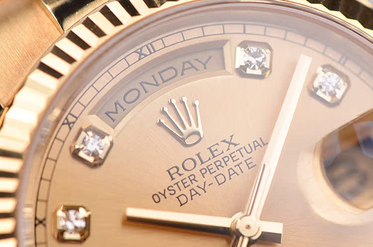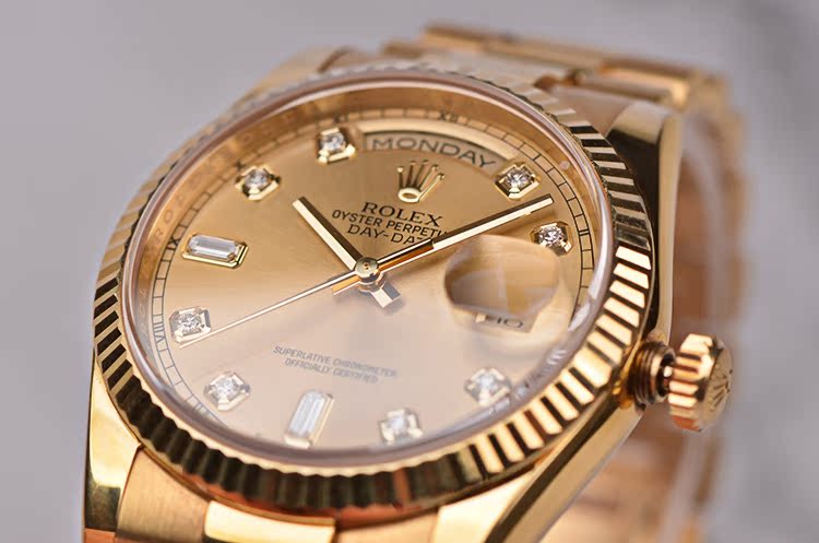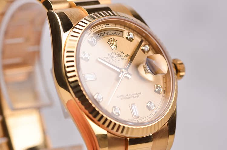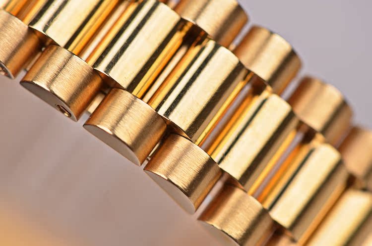 表盘:立体香槟金色面盘,钻石时标(6、9位置为长条钻)