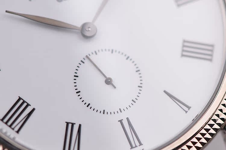 表盘:白色搪瓷表盘,黑色罗马数字刻度
