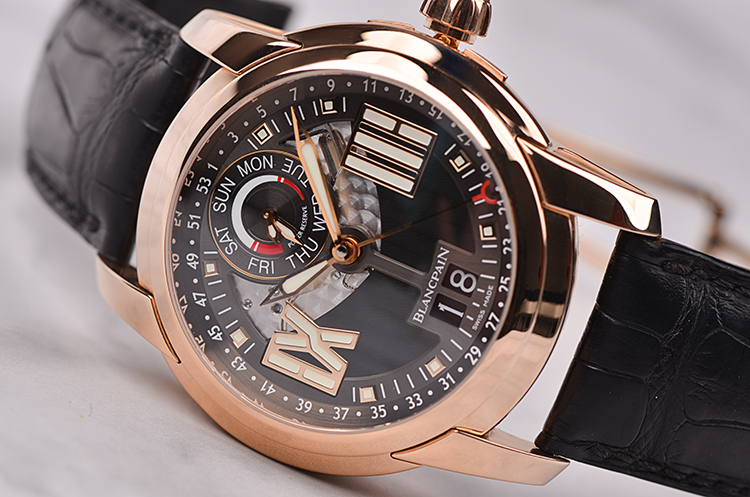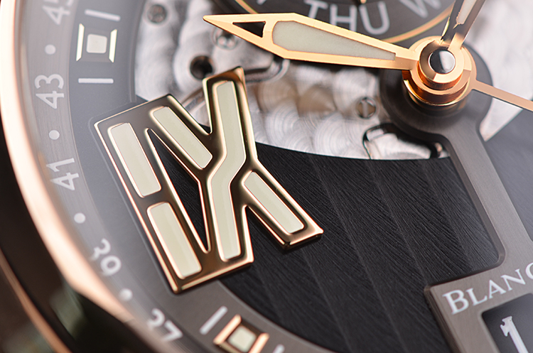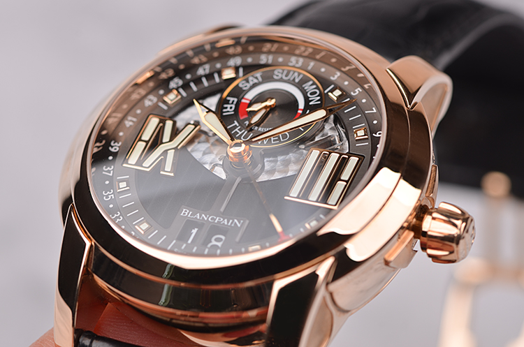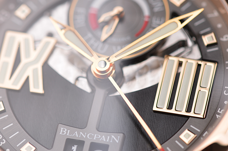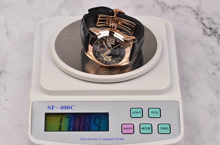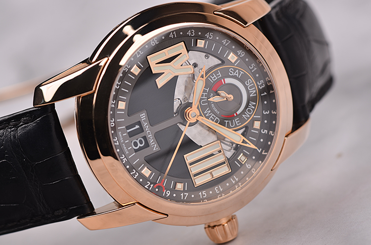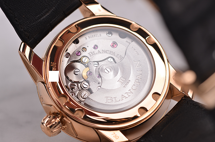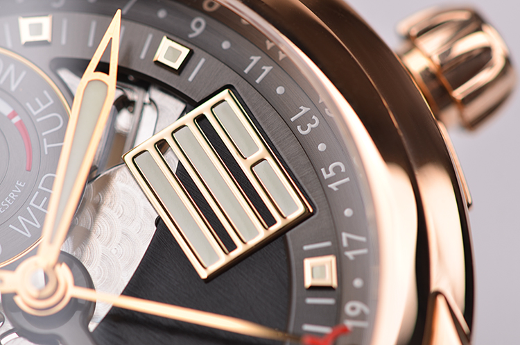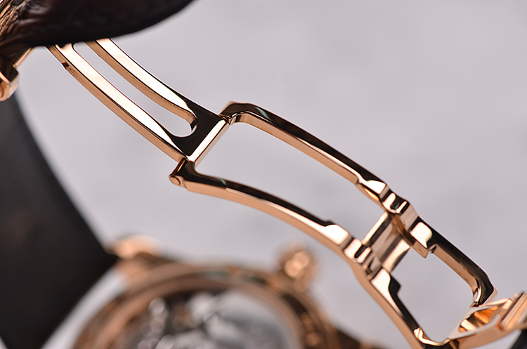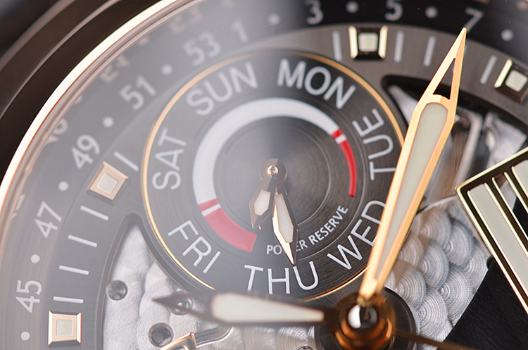 表盘:立体黑色镂空表盘,玫瑰金夜光刻度及指针,星期,日历,周历,动力储备显示
