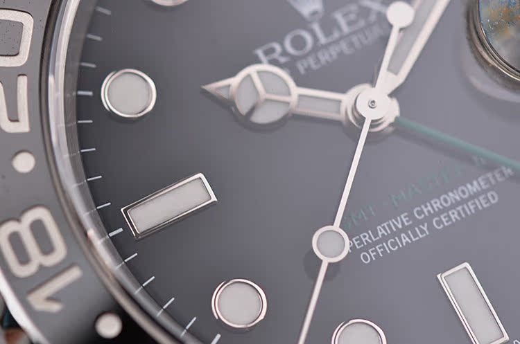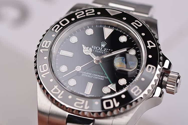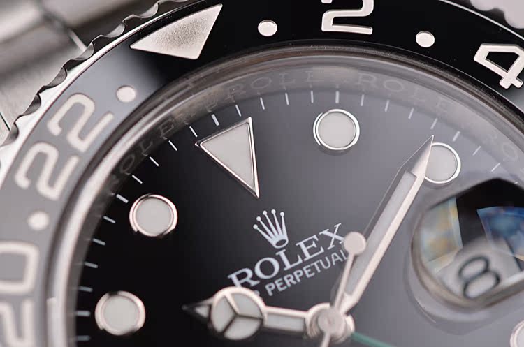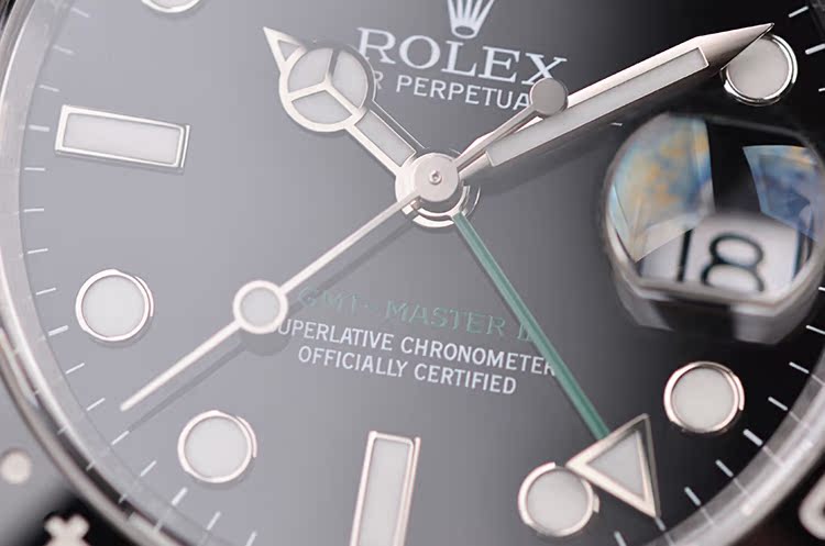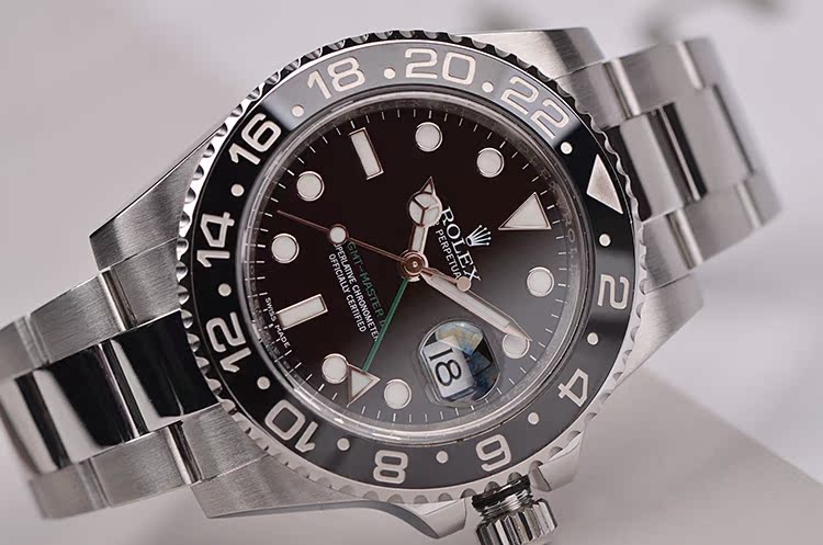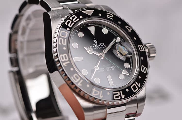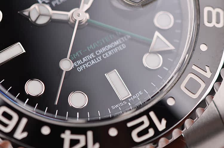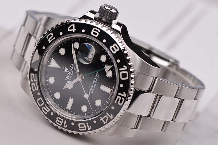 表盘:立体黑色表盘,夜光指针及刻度,绿色GMT指针