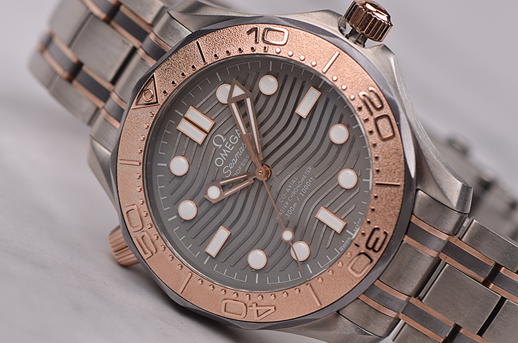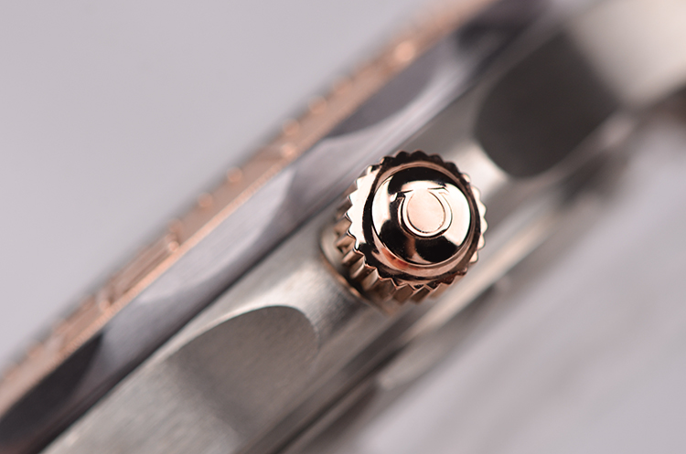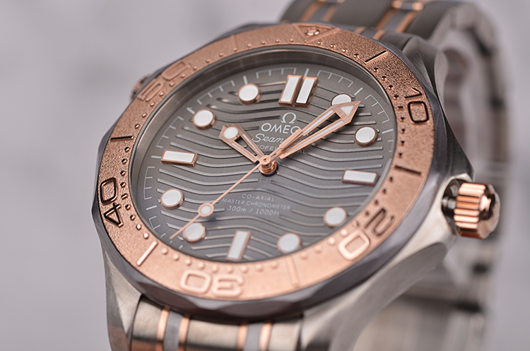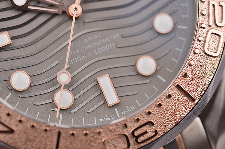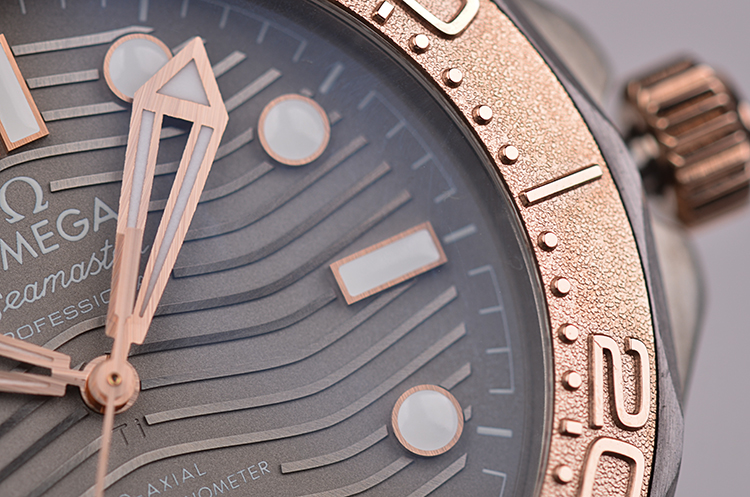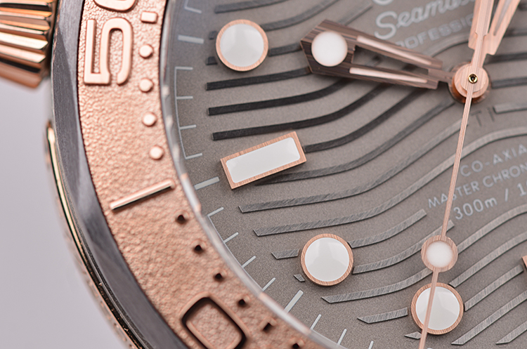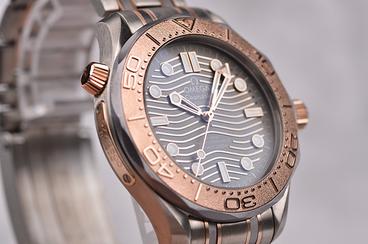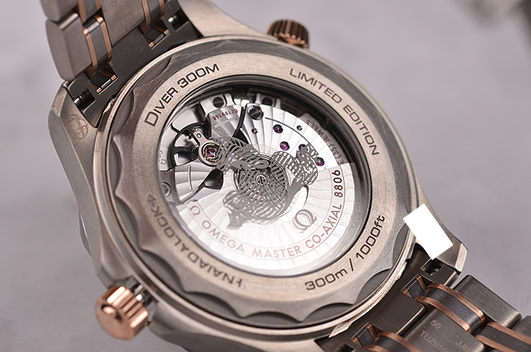 表壳、表圈、表链分别由钛合金,钽金属,玫瑰金三种金属制成,圣伯纳狗头印记。蓝宝石水晶镜面及海马图案蓝宝石底盖,立体灰色波浪纹表盘,夜光指针及刻度,天文台认证标识。表壳侧面10点位排氦气阀门,玫瑰金限量编号铭牌,口径42MM*13.56MM。玫瑰金旋入式防水表冠,防水300M。