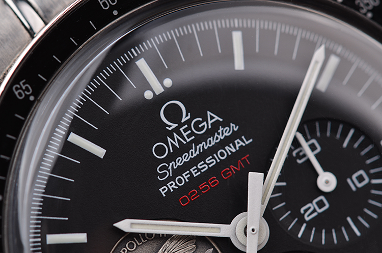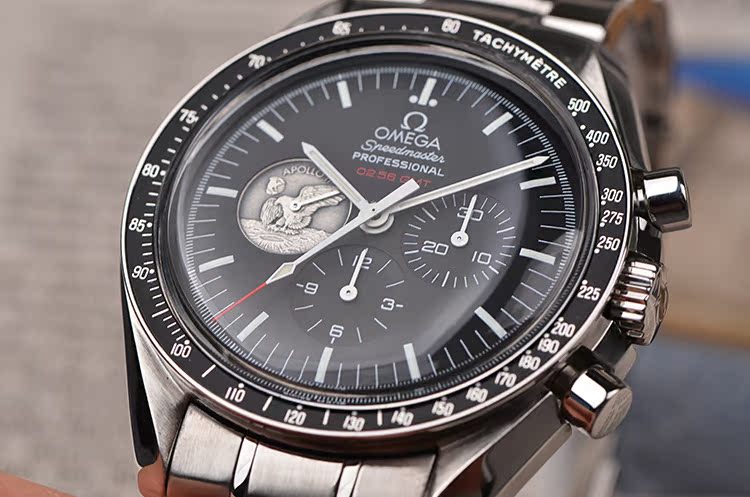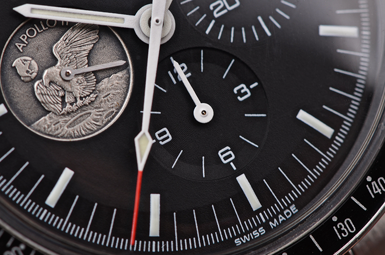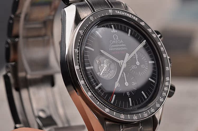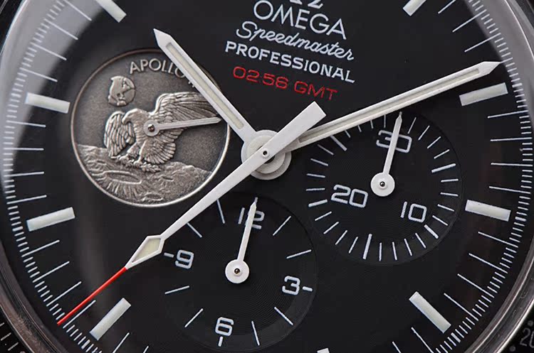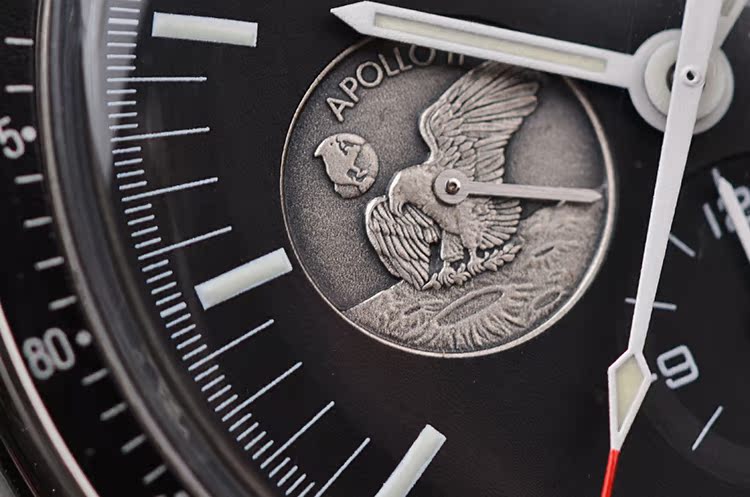 表盘:黑色表盘,9点位小秒针为阿波罗11号任务奖章,夜光刻度及指针,雕刻底盖,刻印限量编号。