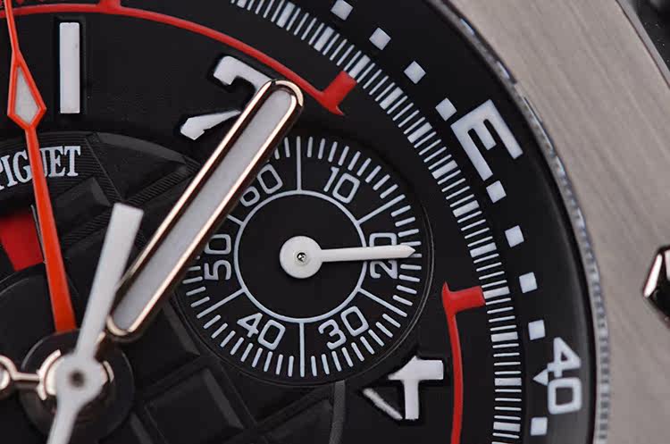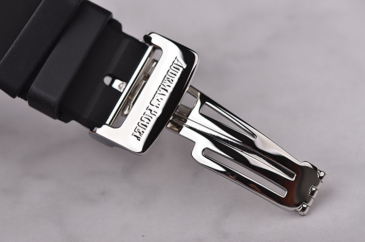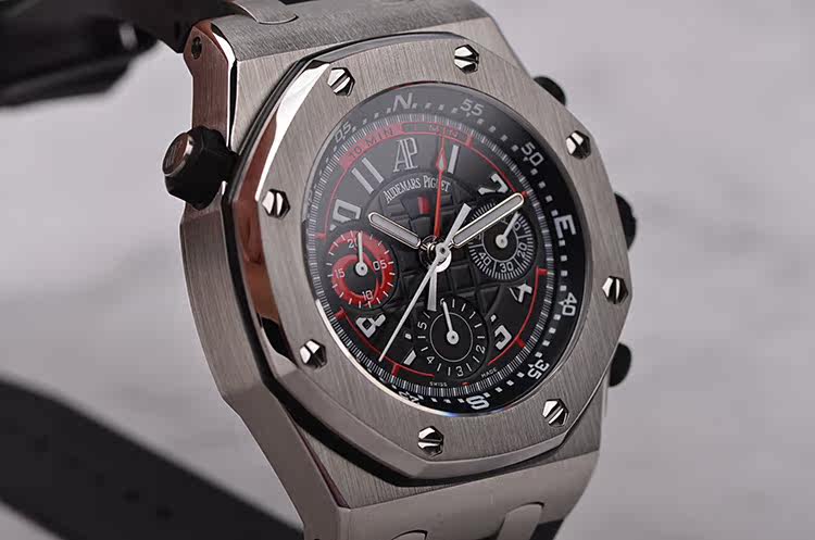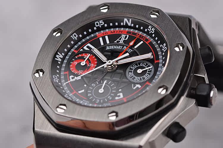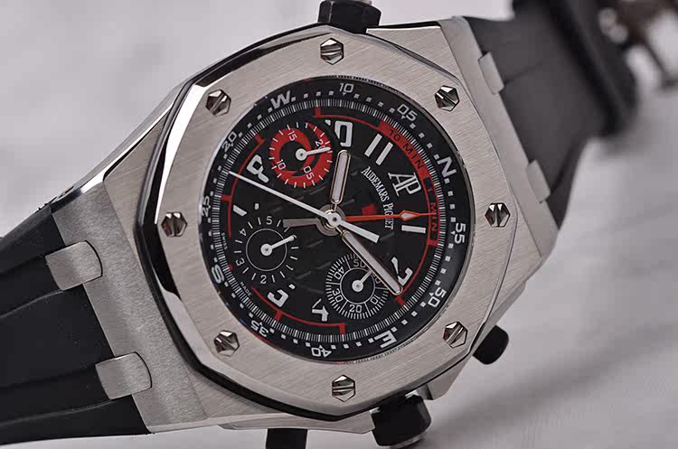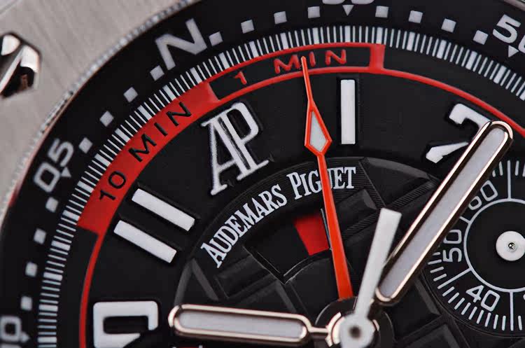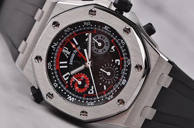 精钢八角形皇家橡树表壳及折叠表扣,原厂黑色橡胶表带成色极新。前后盖白金螺丝。蓝宝石水晶镜面,立体黑色计时表盘,可旋转倒数计时表内圈,10分钟,20分钟及6小时计时功能,9点位印有Alinghi号帆船徽标,带护桥的旋入式防水表冠。口径42MM*14.7MM。防水100M。