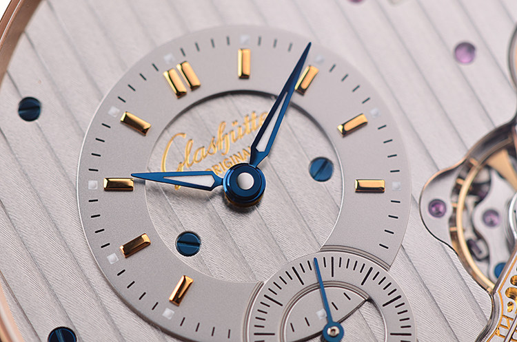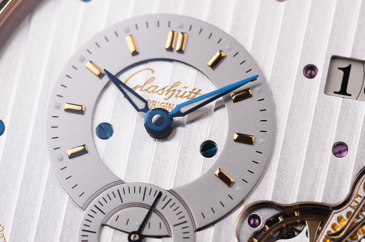 表盘:立体银灰色竖条纹镂空表盘,偏心设计,大日历视窗