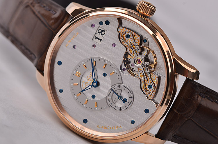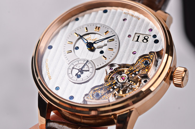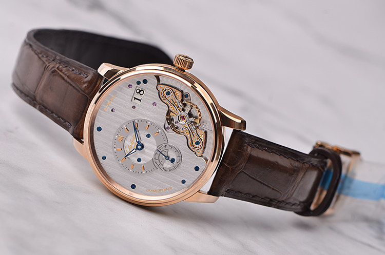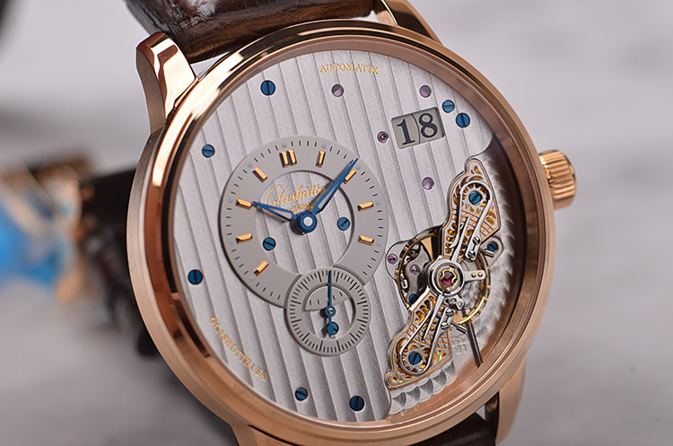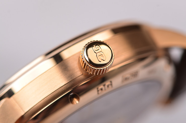 玫瑰金偏心大日历鹅颈反做自动机械折叠扣皮带男表