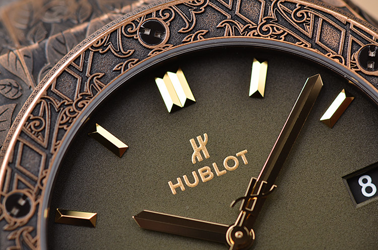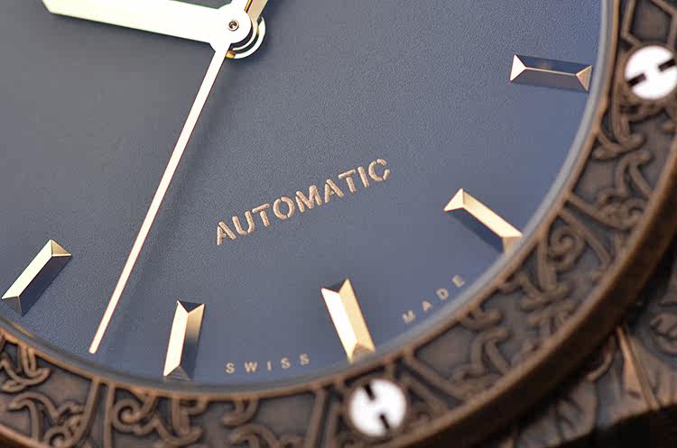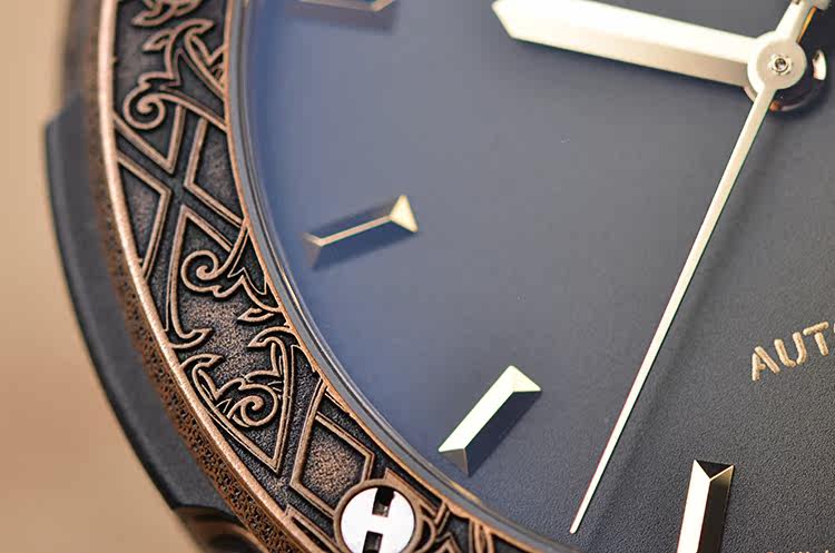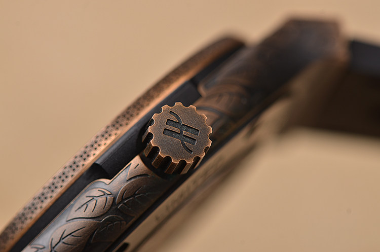 精美绝伦的青铜雕花表壳及表圈,青铜及黑色pvd钢折叠表扣,墨绿色鳄鱼皮内衬橡胶表带。抗反光涂层蓝宝石水晶镜面,立体墨绿色表盘,黄金刻度及指针,3点位日历窗口。口径45MM*10.95MM,防水50M。