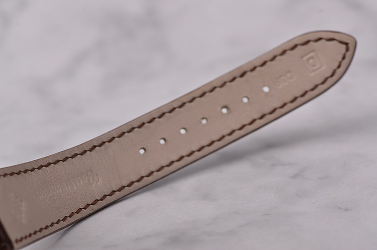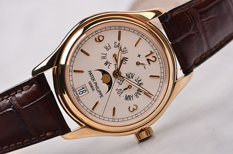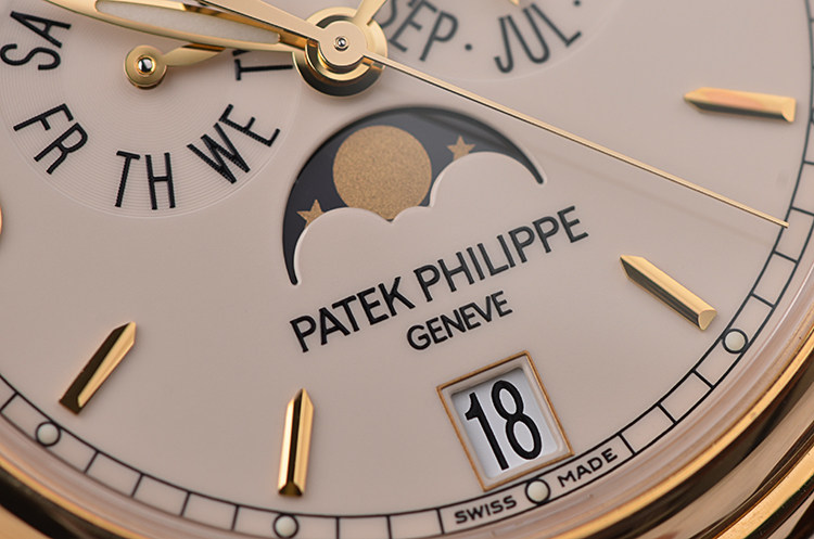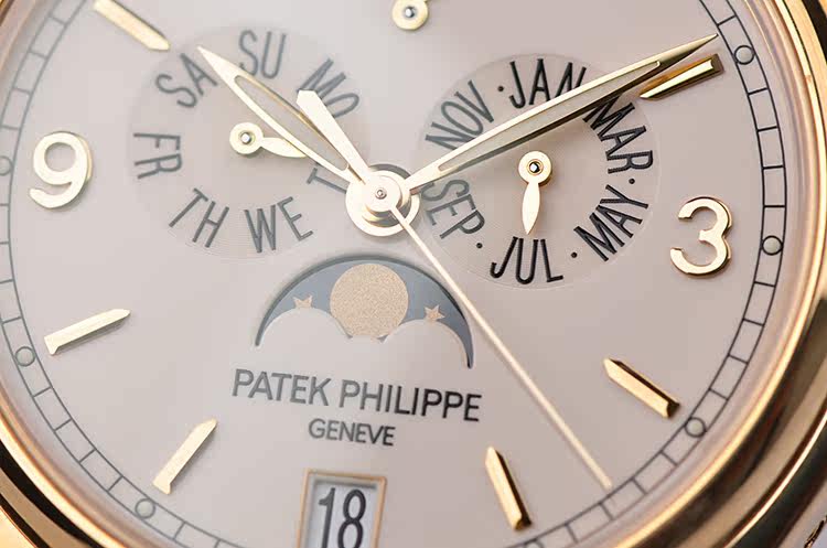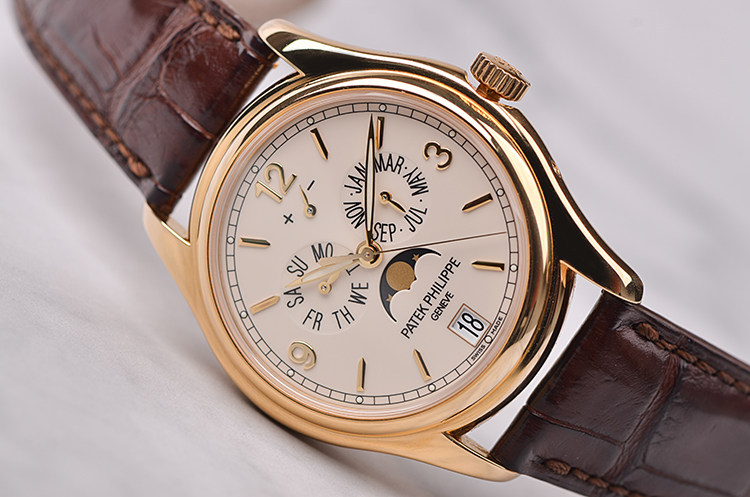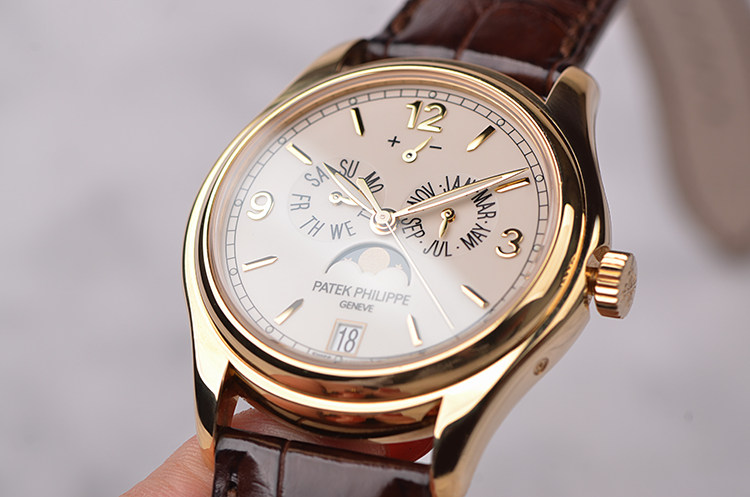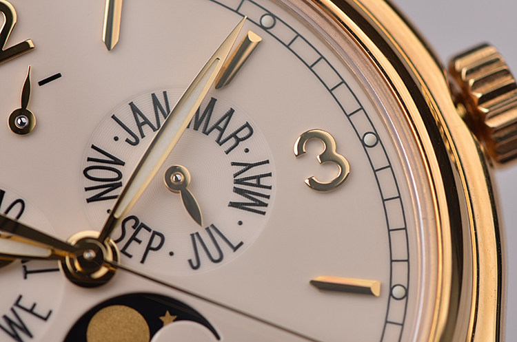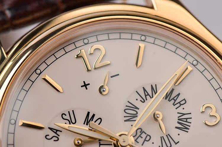 表盘:立体乳白色表盘,黄金刻度及指针,年历,月相,动力储备显示