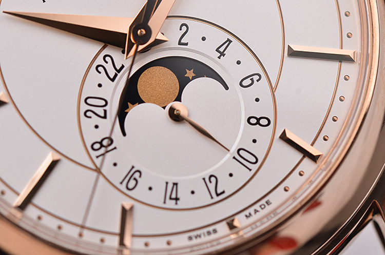 表盘:立体白色表盘,玫瑰金刻度及指针,年历,月相,昼夜显示