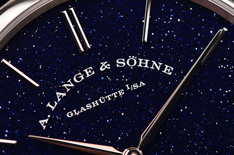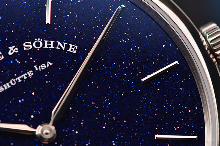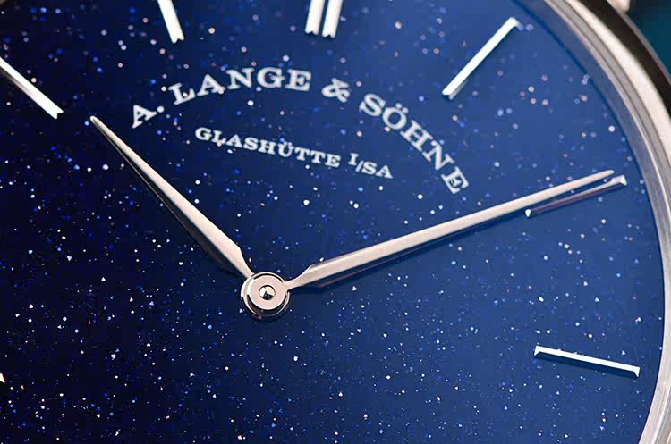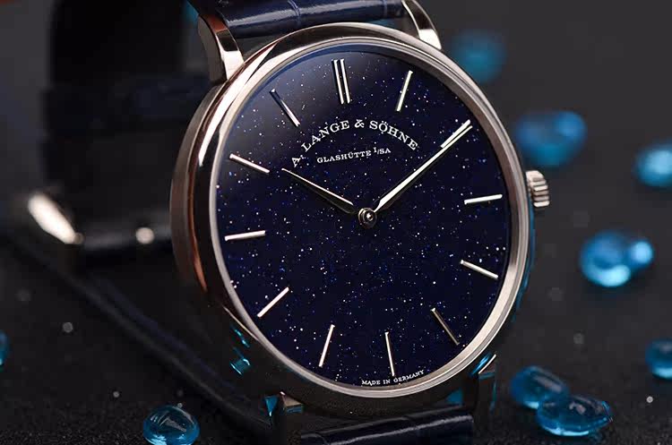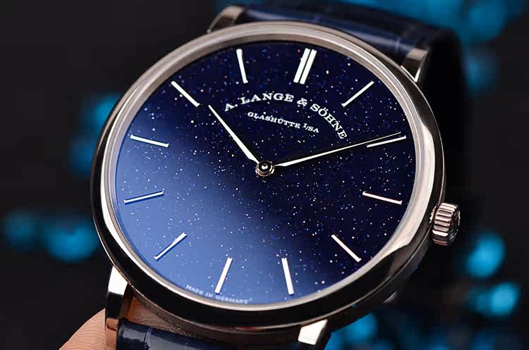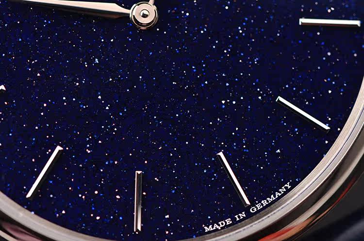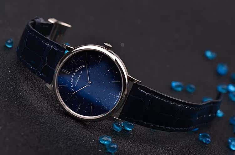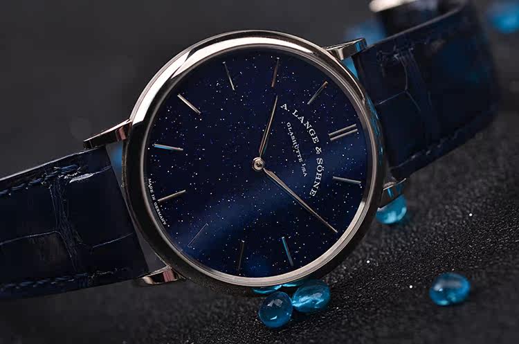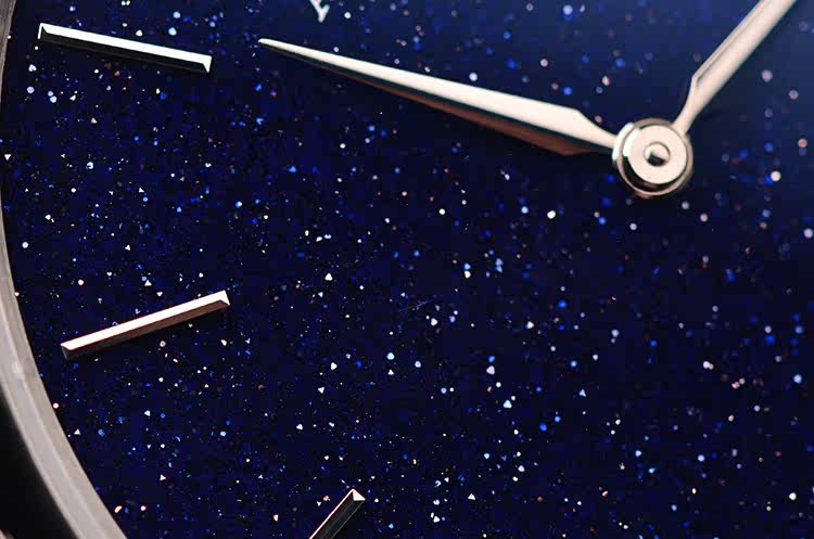 表盘:立体铜蓝色沙金石表盘,颜色设计深邃优雅,呈现星空神秘梦幻色彩,白金刻度及指针