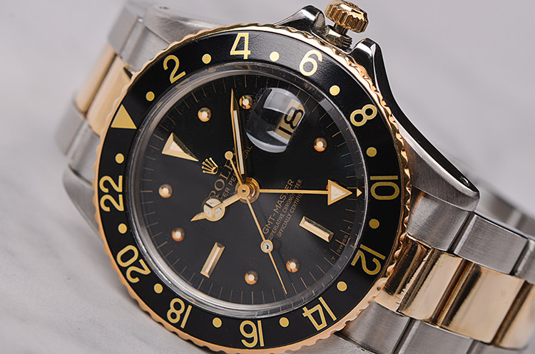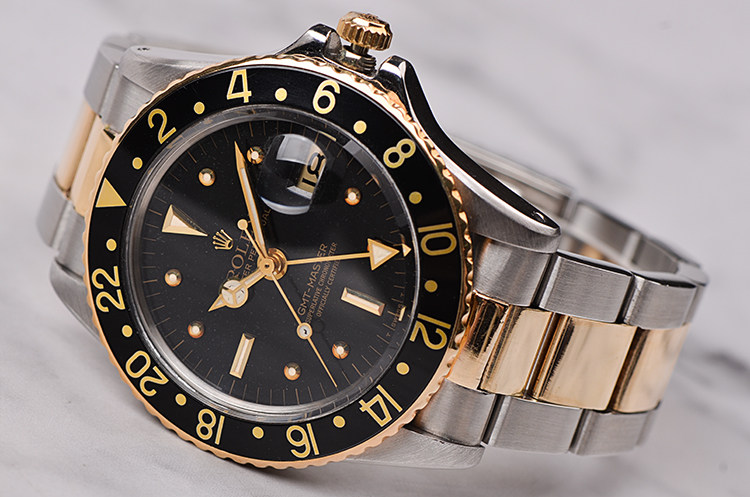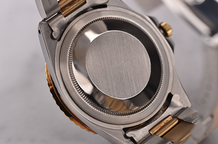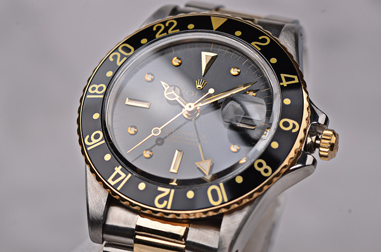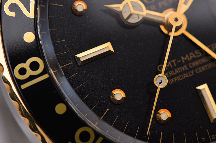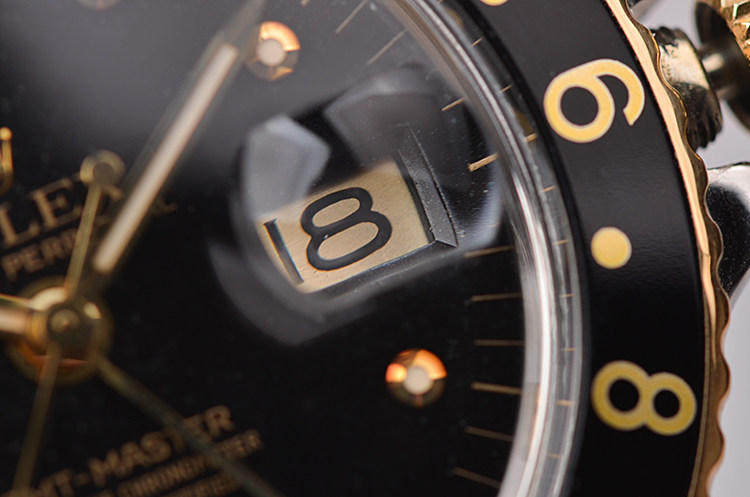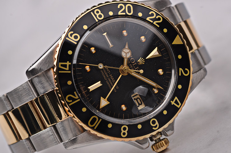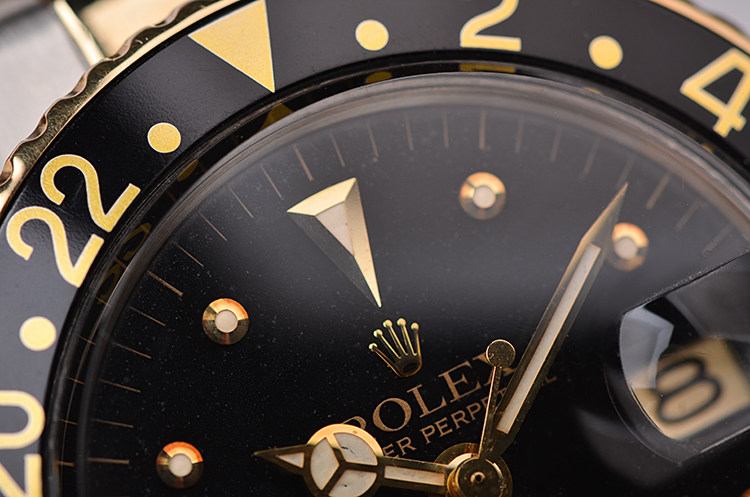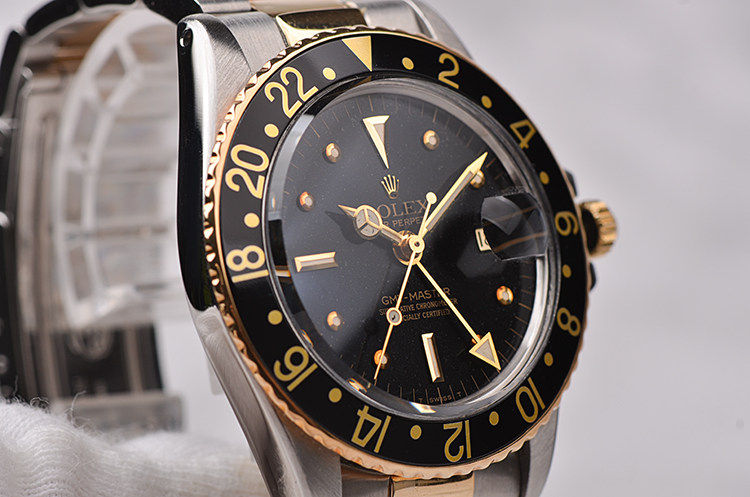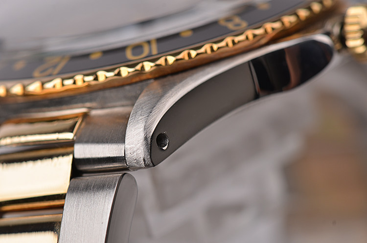 精钢及18K黄金表壳及链带,黑色双向旋转GMT表圈。亚克力泡泡镜,立体黑色表盘(已自然氧化,蜘蛛沙金面),黄金刻度及指针,GMT第二时区功能。3点位放大镜日历视窗。旋入式防水表冠。口径40MM*13MM。防水100M。