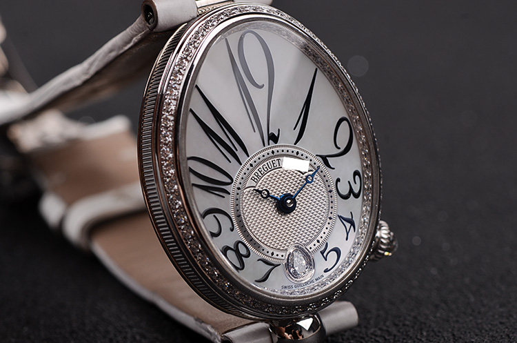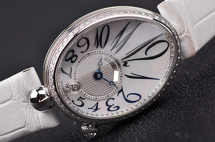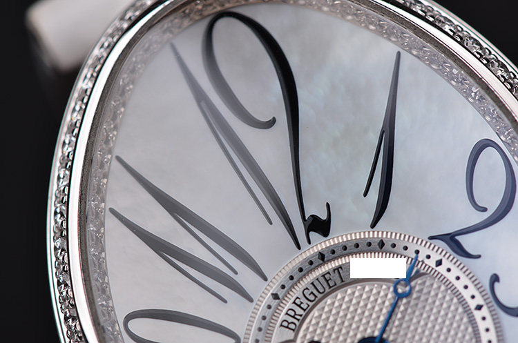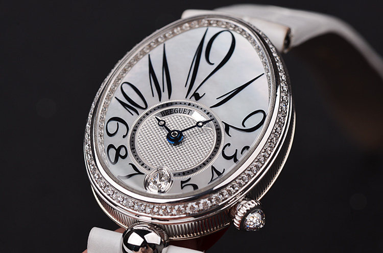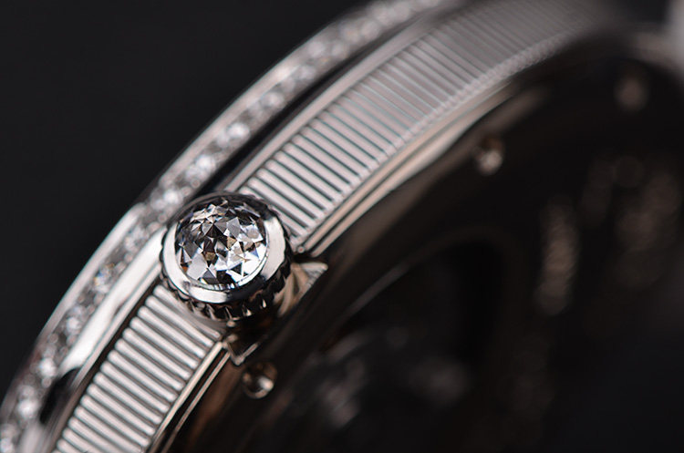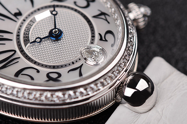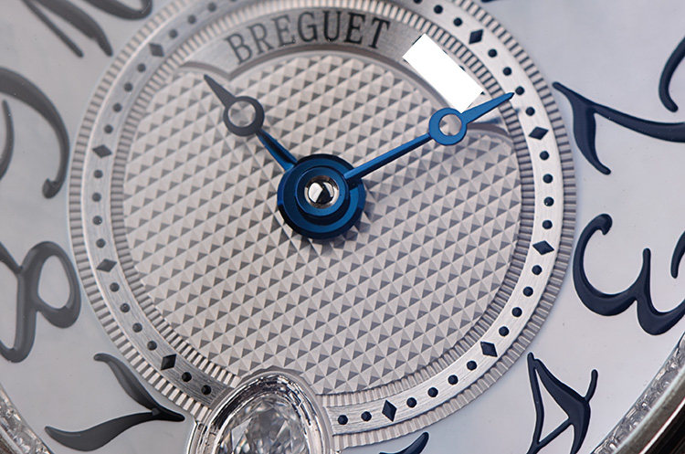 表盘:立体银白色珍珠贝母面盘,阿拉伯数字刻度,蓝钢鱼眼指针,6点位镶嵌一颗梨形大钻