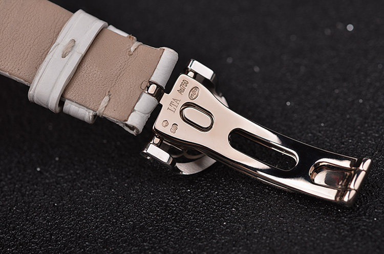 表壳:18K白金鹅蛋形表壳,表框原厂镶嵌117颗天然美钻,约0.99克拉,表冠镶嵌一颗大钻,约0.26克拉。18K白金镶钻折叠表扣