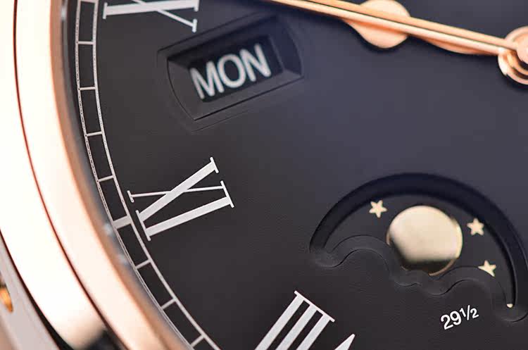 表盘:立体黑色万年历月相表盘,白色罗马数字刻度,玫瑰金指针